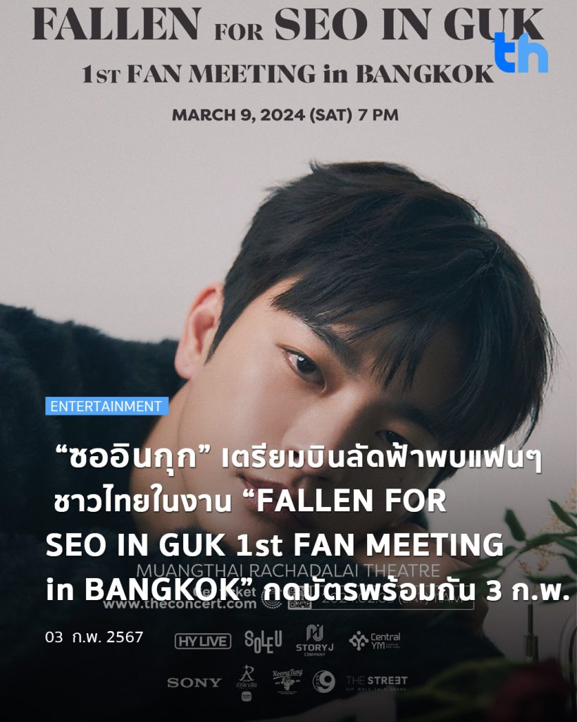 โดยในงาน “FALLEN FOR SEO IN GUK 1st FAN MEETING in BANGKOK” แฟนๆ จะได้รับชมโชว์สุดพิเศษที่ซออินกุกได้ซุ่มซ้อมเป็นอย่างดี จัดเต็มความฟินแบบจุใจเพื่อแฟนๆ ชาวไทยโดยเฉพาะ งานนี้จะฟินและอบอุ่นขนาดไหน เตรียมกดบัตรพร้อมกันวันเสาร์ที่ 3 กุมภาพันธ์ 2567 เวลา 11:00 น. นี้ ราคาบัตร 5,500 / 4,500 / 3,500 / 2,500 บาท (ราคาไม่รวมค่าธรรมเนียมการออกบัตรและค่าบัตรพลาสติก) ซื้อบัตรได้ที่ www.theconcert.com หรือผ่านทางแอปพลิเคชัน The Concert เท่านั้น