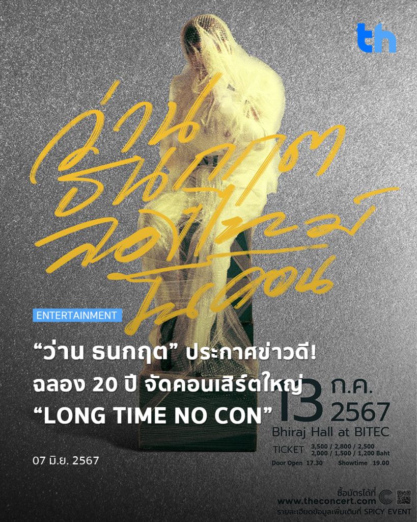 โดยคอนเสิร์ต LONG TIME NO CON (ลองไทม์ โน คอน) จะมีขึ้นในวันเสาร์ ที่ 13 กรกฏาคม 2567 ณ ภิรัช ฮอลล์ ไบเทคบางนา (Bhiraj Hall at BITEC) เปิดขายบัตรวันแรก เสาร์ที่ 8 มิถุนายน 2567 The Concert Application บัตรราคา 3,500, 2,800, 2,500, 2,000, 1,500, 1,200 บาท พิเศษสำหรับใครที่ซื้อบัตรในราคา 3,500 บาท จะได้รับสิทธิพิเศษได้ถ่ายรูปหนึ่งต่อหนึ่ง, Backstage Tour, Hi Touch, Album Long Time No Song, Poster พร้อมลายเซ็นต์ ปักมุดกันไว้แล้วไปเจอกันที่คอนเสิร์ต ติดตามรายละเอียดเพิ่มเติมได้ทาง FB / IG : Wan Thanakrit Fanpage / SPICYDISC / Spicyevent