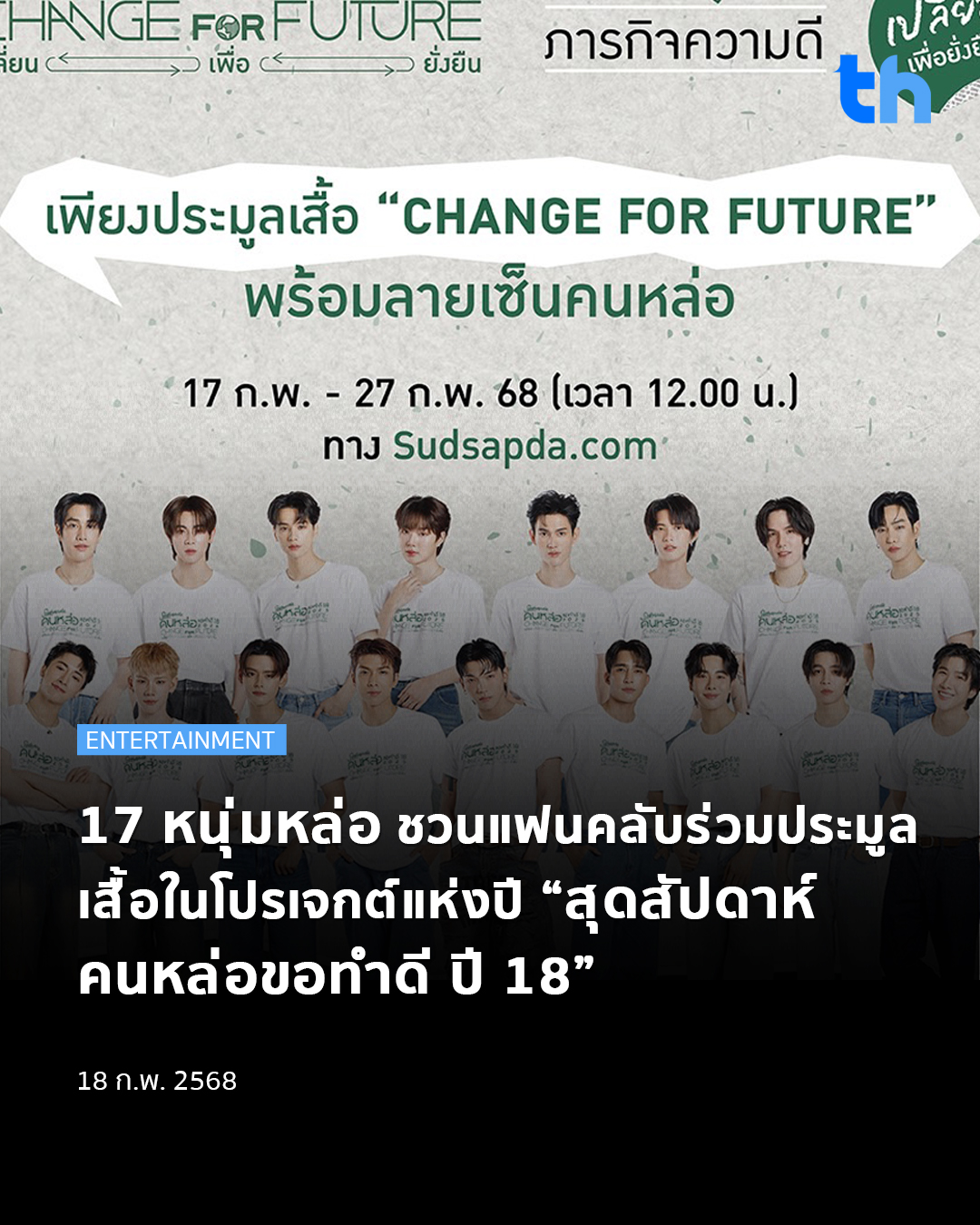 ซึ่งทั้ง 17 คนจะเป็นตัวแทนในการร่วมทำภารกิจ “เปลี่ยน เพื่อ ยั่งยืน” รวมตัวกันเป็นพลังเล็กๆ เพื่อสร้างการเปลี่ยนแปลงอย่างยั่งยืน อีกทั้งยังเป็นกระบอกเสียงในการช่วยเหลือสังคมในรูปแบบต่างๆ โดยผสมผสานแนวคิด “Sustainability“ ชวนกัน “เปลี่ยน” เพื่อสร้างความสุข และโอกาสของตัวเองรวมถึงคนรอบข้าง “เปลี่ยน” เพื่อสร้างความรัก “เปลี่ยน” เพื่อความน่าอยู่ของสังคม “เปลี่ยน” เพื่อใช้ชีวิตให้เป็นมิตรกับสิ่งแวดล้อม โดยทั้ง 17 คนจะร่วมงานแถลงข่าว “สุดสัปดาห์คนหล่อขอทำดี ปี 18” ในวันที่ 5 มีนาคม 2568 ณ Parade Square, ชั้น G, Parade at One Bangkok