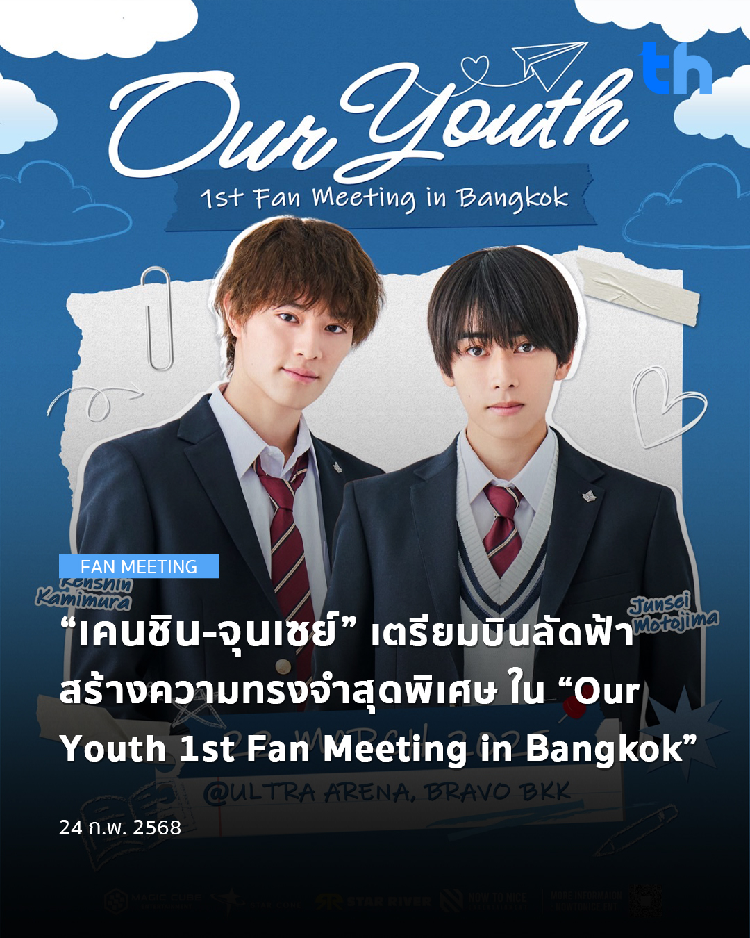 เตรียมสร้างความทรงจำ พร้อมกระชับหัวใจให้ได้ใกล้ชิด และเติมเต็มความสุขอันแสนอบอุ่นไปกับ “คามิมูระ เคนชิน” และ “โมโตจิมะ จุนเซย์” สองนักแสดงนำสุดฮอตจากซีรีส์เรื่อง “Our Youth วัยเยาว์ของเรา” ที่พวกเขาเตรียมพร้อมบินลัดฟ้ามาพบเจอกับแฟนๆชาวไทยเป็นครั้งแรก! งานนี้ผู้จัดอย่าง “Magic Cube Entertainment” และ “Now to Nice Entertainment” เตรียมพร้อมร่วมกันเนรมิตรงานแฟนมีตติ้งสุดอบอุ่นเพื่อแฟนๆของทั้งสองหนุ่มกับงาน “Our Youth 1st Fan Meeting in Bangkok” ซึ่งจะจัดขึ้นในวันเสาร์ที่ 22 มีนาคม 2568 เวลา 14:00 น. ณ Ultra Arena Hall, Bravo BKK