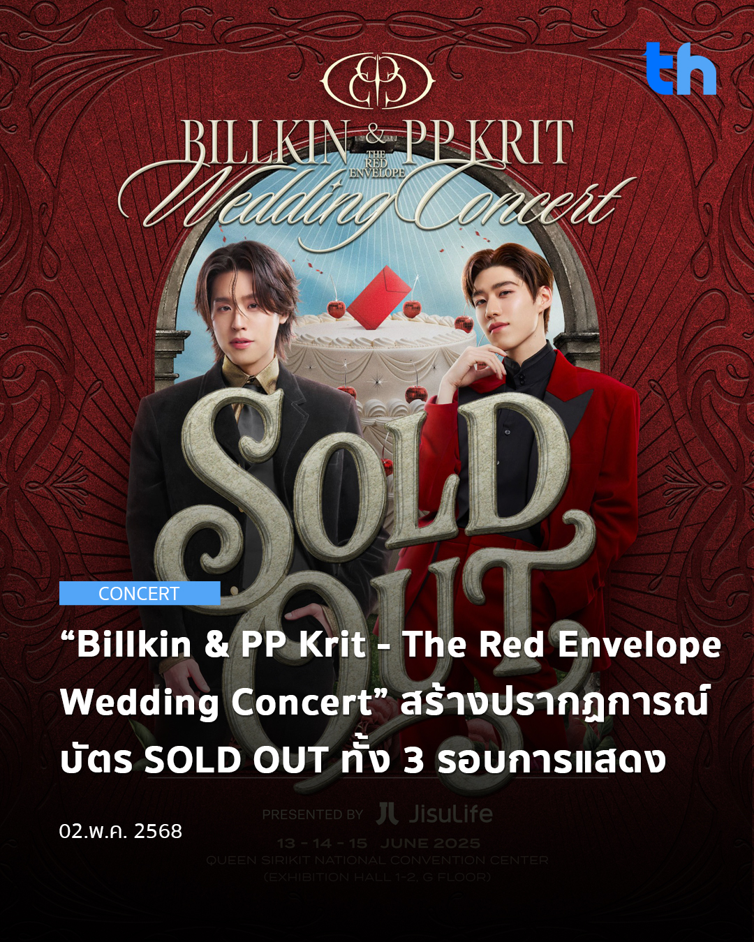 เตรียมพบกับความสนุก ความสุข และโมเมนต์สุดประทับใจ กับค่ำคืนสุดพิเศษไปด้วยกันใน “Billkin & PP Krit – The Red Envelope Wedding Concert Presented by JisuLife” ในวันศุกร์ ที่ 13 รอบ 19:00 น. วันเสาร์ ที่ 14 รอบ 18:00 น. วันอาทิตย์ 15 รอบ 18:00 น. มิถุนายน 2568 ณ ศูนย์การประชุมแห่งชาติสิริกิติ์ (Exhibition Hall 1-2, ชั้น G)