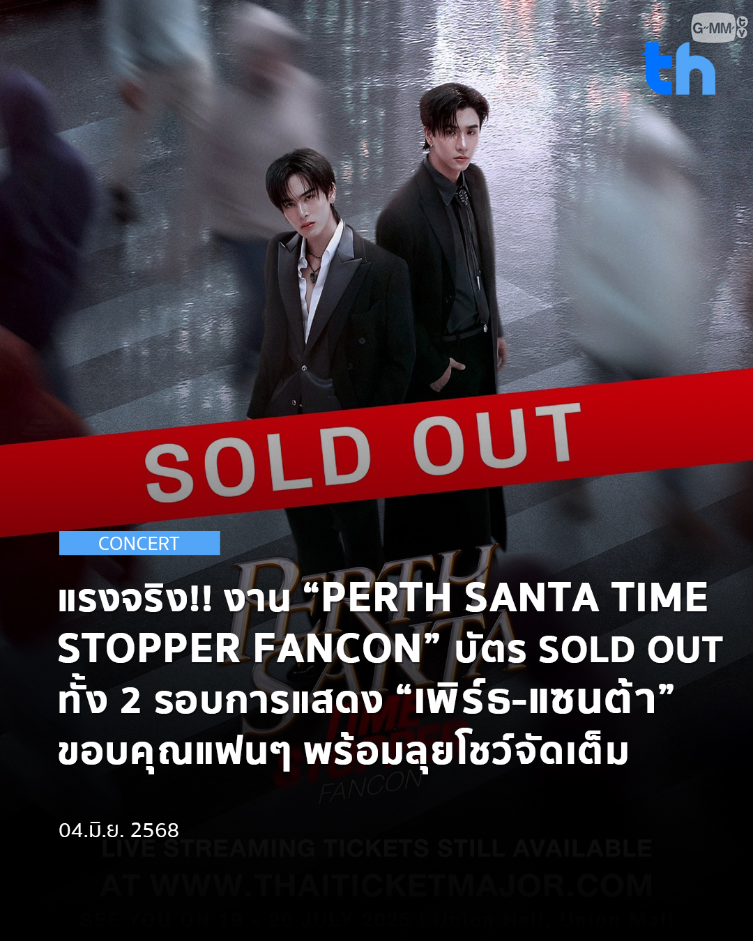 เรียกว่าปังไม่หยุดฉุดไม่อยู่แล้วนาทีนี้ สำหรับงาน “PERTH SANTA TIME STOPPER FANCON” แฟนคอนครั้งแรกของสองหนุ่มสุดฮอต “เพิร์ธ-ธนพนธ์ สุขุมพันธนาสาร” และ “แซนต้า-พงศภัค อุดมโภชน์” จาก “GMMTV” คอนเทนต์โพรไวเดอร์ชั้นนำของเมืองไทย ที่ได้รับกระแสตอบรับแบบถล่มทลาย บัตร SOLD OUT ทั้ง 2 รอบการแสดงอย่างรวดเร็ว ซึ่งจะจัดขึ้นในวันเสาร์ที่ 19 และวันอาทิตย์ที่ 20 กรกฎาคม 2568 เวลา 17.00 น. ณ ยูเนี่ยน ฮอลล์ ชั้น F6 ศูนย์การค้ายูเนี่ยน มอลล์ โดยหนุ่มๆ “เพิร์ธ-แซนต้า” ขอขอบคุณแฟนๆ ทุกคน สำหรับการตอบรับด้วยดีในครั้งนี้