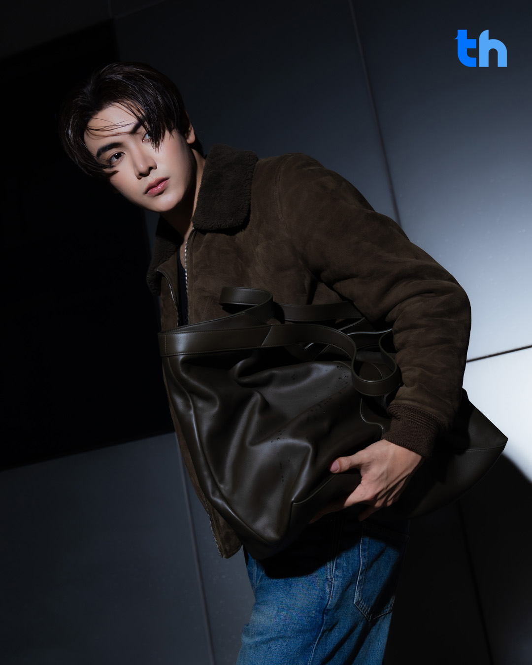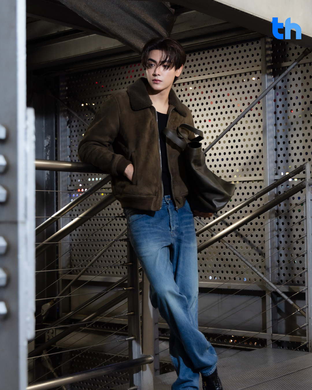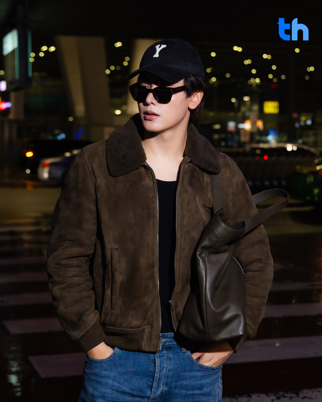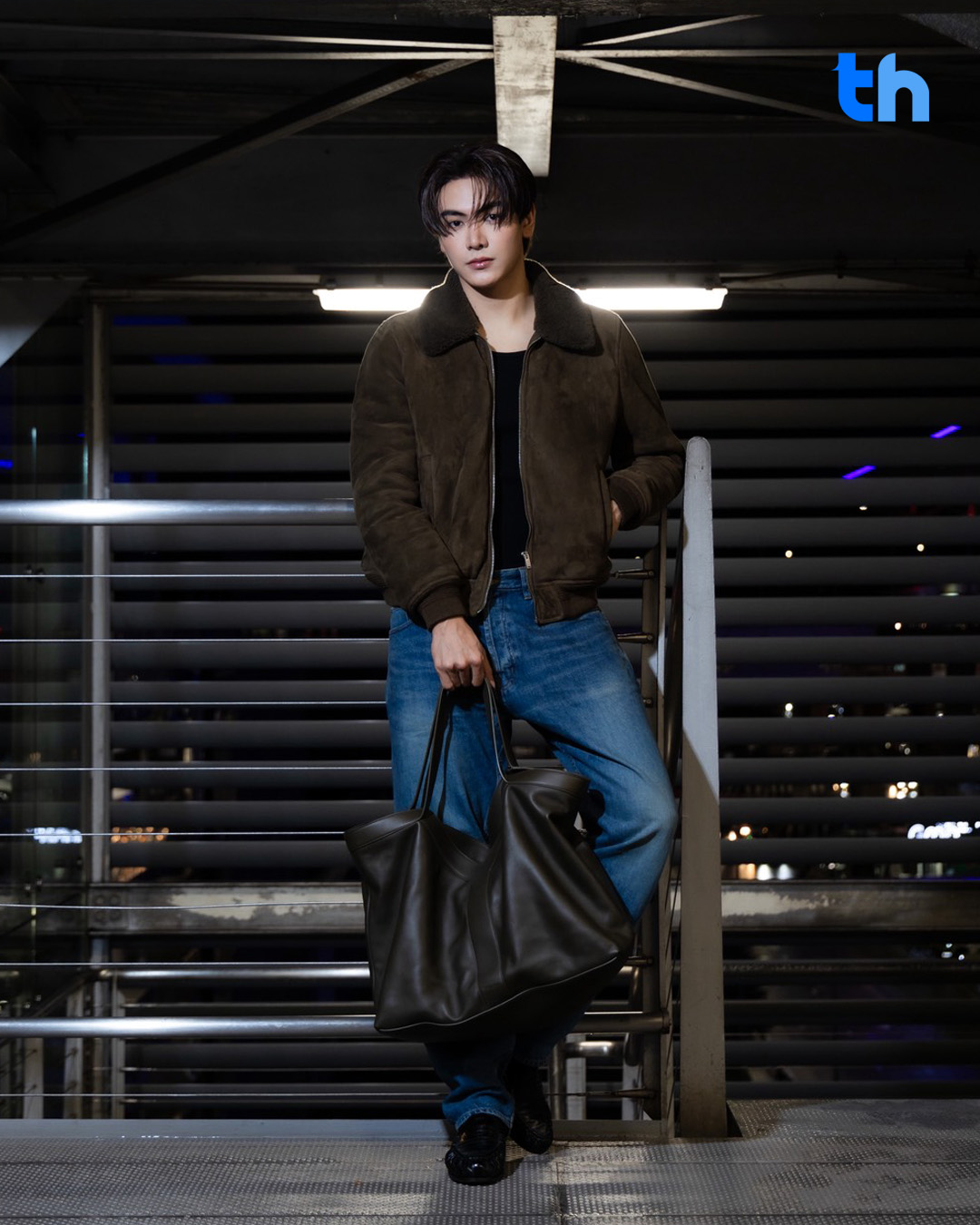อุ่นเครื่องก่อนเดินทางด้วย แอร์พอร์ตลุคสุดเท่ ที่ผสมผสานความเรียบโก้ในสไตล์ Saint Laurent ได้อย่างลงตัว โดย “จุง อาเชน” เลือกสวม Bomber Jacket in Suede and Shearling (Kaki Foncé)