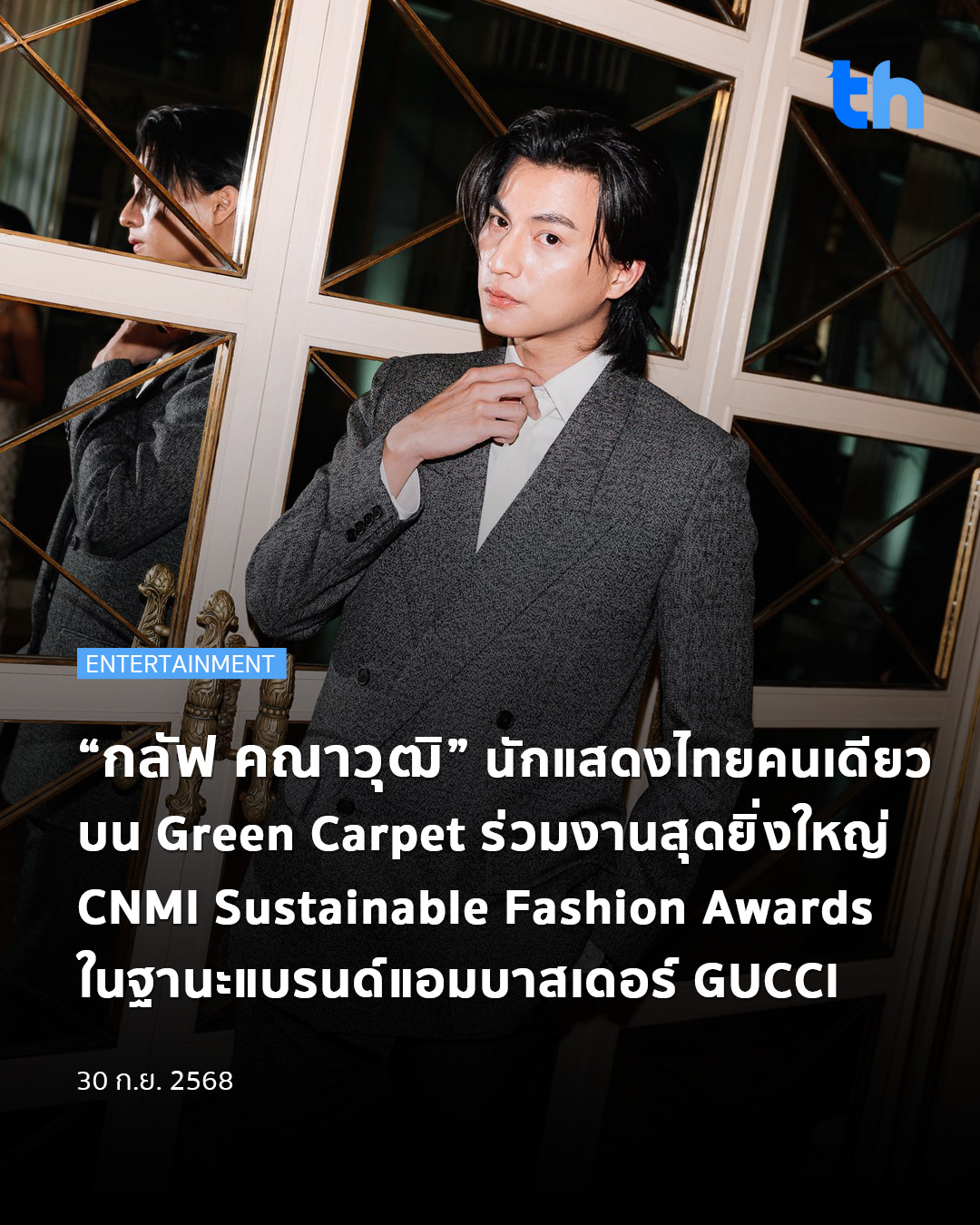 ออร่าเป็นแก้วเป็นแสง! สร้างเรื่อง อิน มิลาน อีกแล้ว!! “กลัฟ – คณาวุฒิ ไตรพิพัฒนพงษ์” นักแสดงหนุ่มชื่อดังของไทย ไม่เพียงแค่ปรากฏตัวในงานแฟชั่นโชว์ของ Ferrari อย่างมีสไตล์เท่านั้น แต่ กลัฟยังเป็นนักแสดงไทยคนแรกที่ได้รับเชิญให้ร่วมงาน CNMI Sustainable Fashion Awards 2025 รวมถึงร่วมเดิน Green Carpet พร้อมเหล่าบุคคลผู้มีชื่อเสียงในแวดวงอีกมากมาย