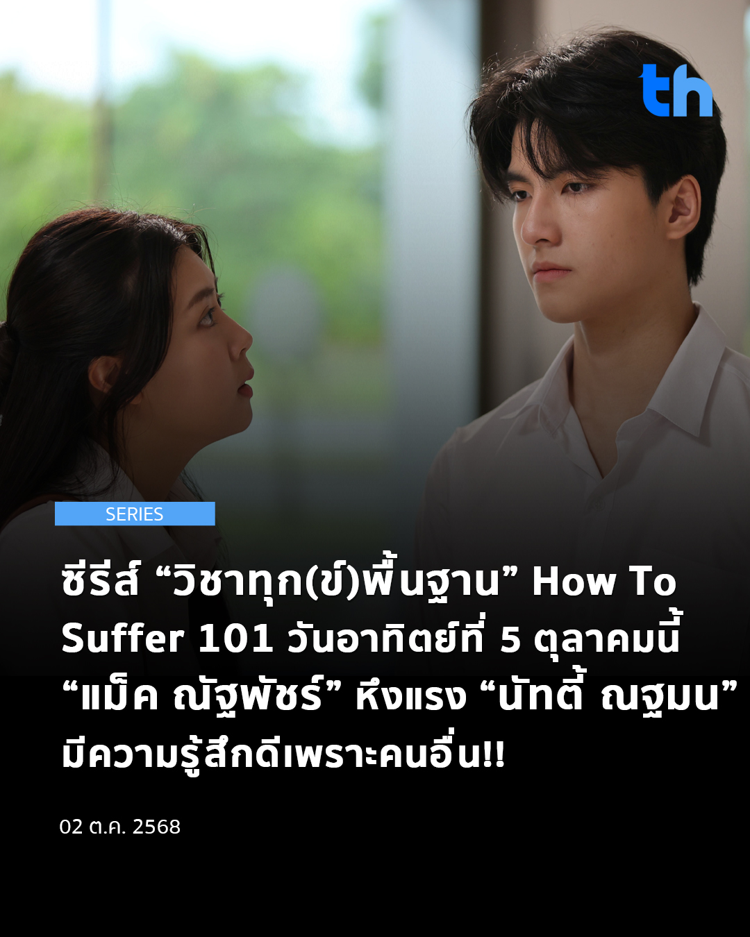 ในซีรีส์ “วิชาทุก(ข์)พื้นฐาน” How To Suffer 101 นำแสดงโดย นิ้ง-ชัญญา แม็คคลอรี่ย์, แมน-ธฤษณุ สรนันท์, ศดานนท์ ดุรงคเวโรจน์, นัทตี้-ณฐมน จันทราวิภาต, แม็ค-ณัฐพัชร์ นิมจิรวัฒน์, มอส-ฏิภาณ ขุนเงิน(มอส มัดจุก) และ แจกัน-อรวรรยา โตสมบัติ จากทีมผู้จัดคุณภาพ จูเวไนล์(JUVE9) ผลงานการกำกับโดย วิรดา คูหาวันต์ รับชมได้ทาง ไทยพีบีเอส