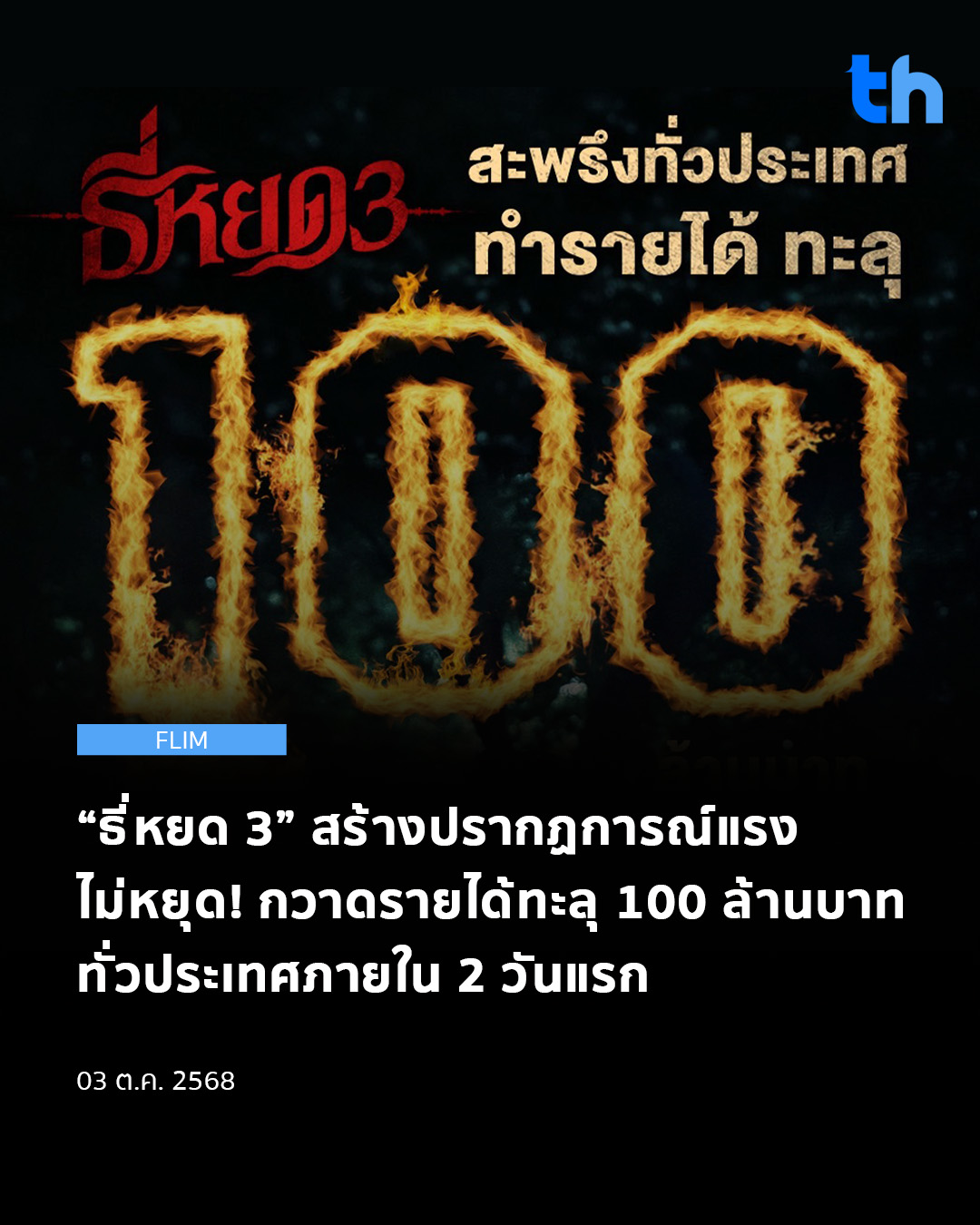 กระแสความสยองสุดสะพรึงแห่งปี ยังคงแรงต่อเนื่อง สำหรับภาพยนตร์ “ธี่หยด 3” ที่เดินหน้าสร้างปรากฏการณ์ใหม่ให้กับวงการหนังไทย หลังเข้าฉายเพียง 2 วันแรก ก็กวาดรายได้ทั่วประเทศ ทะลุ 100 ล้านบาท เป็นที่เรียบร้อย สะท้อนความนิยมและกระแสตอบรับอันล้นหลามจากผู้ชมทั่วประเทศ