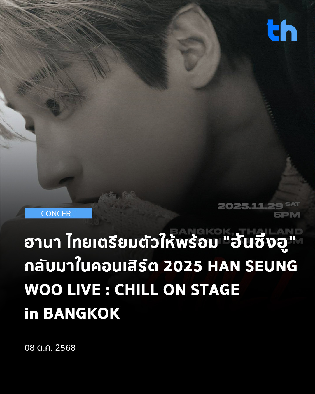 ห่างหายจากประเทศไทยไปถึง 1 ปี “ฮันซึงอู” เตรียมบินลัดฟ้ามาหาชาว “ฮานา”(HAN_A)  ไทย ในรูปแบบคอนเสิร์ต 2025 HAN SEUNG WOO LIVE : CHILL ON STAGE in BANGKOK พร้อมที่จะสร้างความทรงจำที่สวยงามกับแฟน ๆ อีกครั้ง หลังจาก “ฮันซึงอู” คัมแบ็กไปเมื่อเดือนมิถุนายนที่ผ่านมา