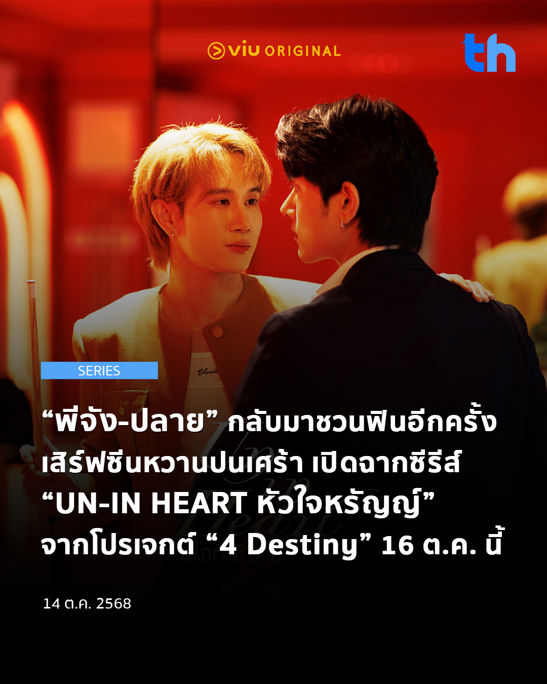 “พีจัง-ปลาย” กลับมาชวนฟินอีกครั้ง เสิร์ฟซีนหวานปนเศร้า เปิดฉากซีรีส์ “UN-IN HEART หัวใจหรัญญ์” จากโปรเจกต์ “4 Destiny” 16 ต.ค.นี้