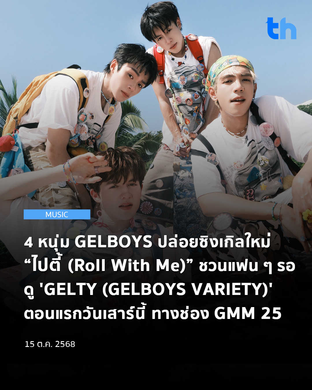 พร้อมเสิร์ฟโมเมนต์ความคึกคักไปกับเพลง ‘ไปตี้ (Roll with Me)’ ซิงเกิลที่สองจาก GELBOYS เพลงประกอบรายการแนวป๊อปแดนซ์กับเทมโป้สุดสนุก ที่ใครได้ยินก็อยากลุกขึ้นมาเต้น ถ่ายทอดพลัง และเคมีสุดซี้ของทั้งสี่หนุ่มออกมาได้อย่างเต็มที่