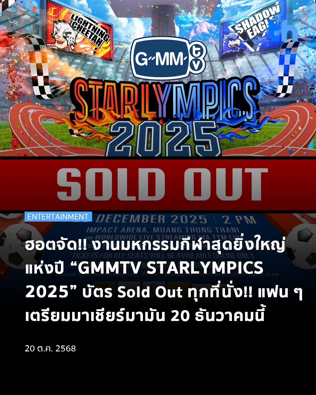 กระแสแรงเกินต้าน บัตร Sold Out ทุกที่นั่งอย่างรวดเร็ว สำหรับมหกรรมกีฬาสุดยิ่งใหญ่แห่งปีที่แฟน ๆ รอคอยมากที่สุด กับงาน “GMMTV STARLYMPICS 2025” ซึ่งจัดขึ้นเป็นปีที่ 3 จาก “GMMTV” คอนเทนต์โพรไวเดอร์ชั้นนำของเมืองไทย ที่ยกขบวนทัพศิลปิน “GMMTV” มาทั้งค่าย พร้อมด้วยเหล่า “Mascot Fandom Character” ที่มาร่วมสร้างสีสันกับการแข่งขันระหว่าง 2 ทีม ได้แก่ “ทีม Lightning Cheetah” และ “ทีม Shadow Eagle”