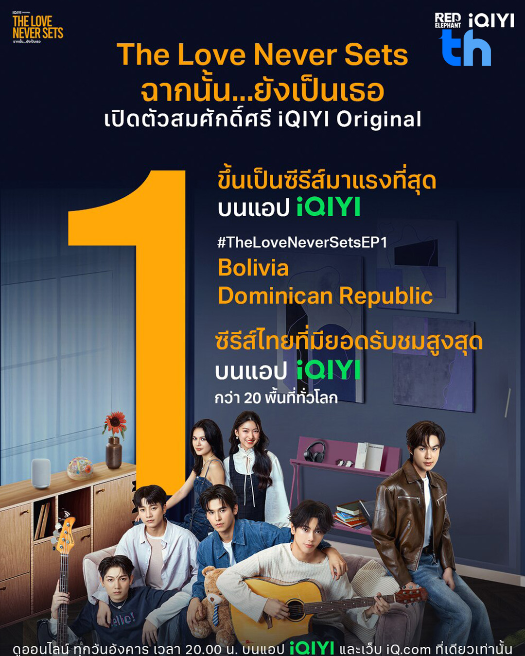 ที่มาพร้อมกับทัพนักแสดงที่มาร่วมสร้างสีสีนอย่าง โบนัส ณัฐวัฒน์, นิกิต้า พาร์คิน, จ๊ะจ๋า จุฑารัตน์, โดม่อน กฤษณ์มงคล และ อะตอม ปิยวัฒน์ ก็ส่งผลให้ซีรีส์ iQIYI Original “The Love Never Sets ฉากนั้น…ยังเป็นเธอ” ยอดคนดูตอนแรกพุ่งสูงจนขึ้นเป็นซีรีส์มาแรงที่สุด และเป็นซีรีส์ไทยที่มียอดการรับชมสูงสุด บนแอป iQIYI (อ้ายฉีอี้) มากกว่า 20 พื้นที่ทั่วโลก และนอกจากนี้ #TheLoveNeverSetsEP1 ก็ยังติดเทรนด์อันดับ 1 บน X ใน Bolivia, Dominican Republic อีกด้วย