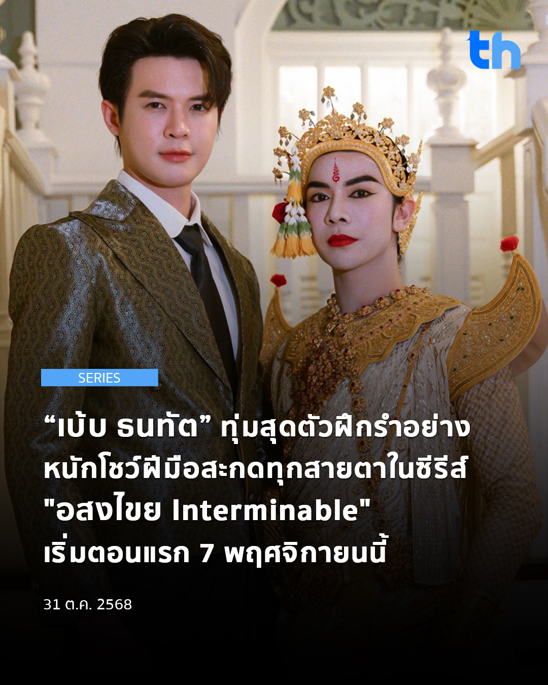 เรียกว่าทุ่มเทเพื่อการพลิกบทบาทครั้งสำคัญ นักแสดงหนุ่มมากฝีมือ “เบ้บ ธนทัต พรรณวิริยะกุล” ต้องฝึกฝนการรำอย่างหนักเพื่อโชว์ฝีมือในบท “แก้วตา” นางรำหนุ่มรูปงามที่สะกดคนดูตั้งแต่แรกเห็นในลุค “แม่หญิงฉุยฉาย” จุดเริ่มต้นของความรักที่จะพันธนาการชั่วนิจนิรันดร์ ในซีรีส์ฟอร์มยักษ์ “อสงไขย Interminable”