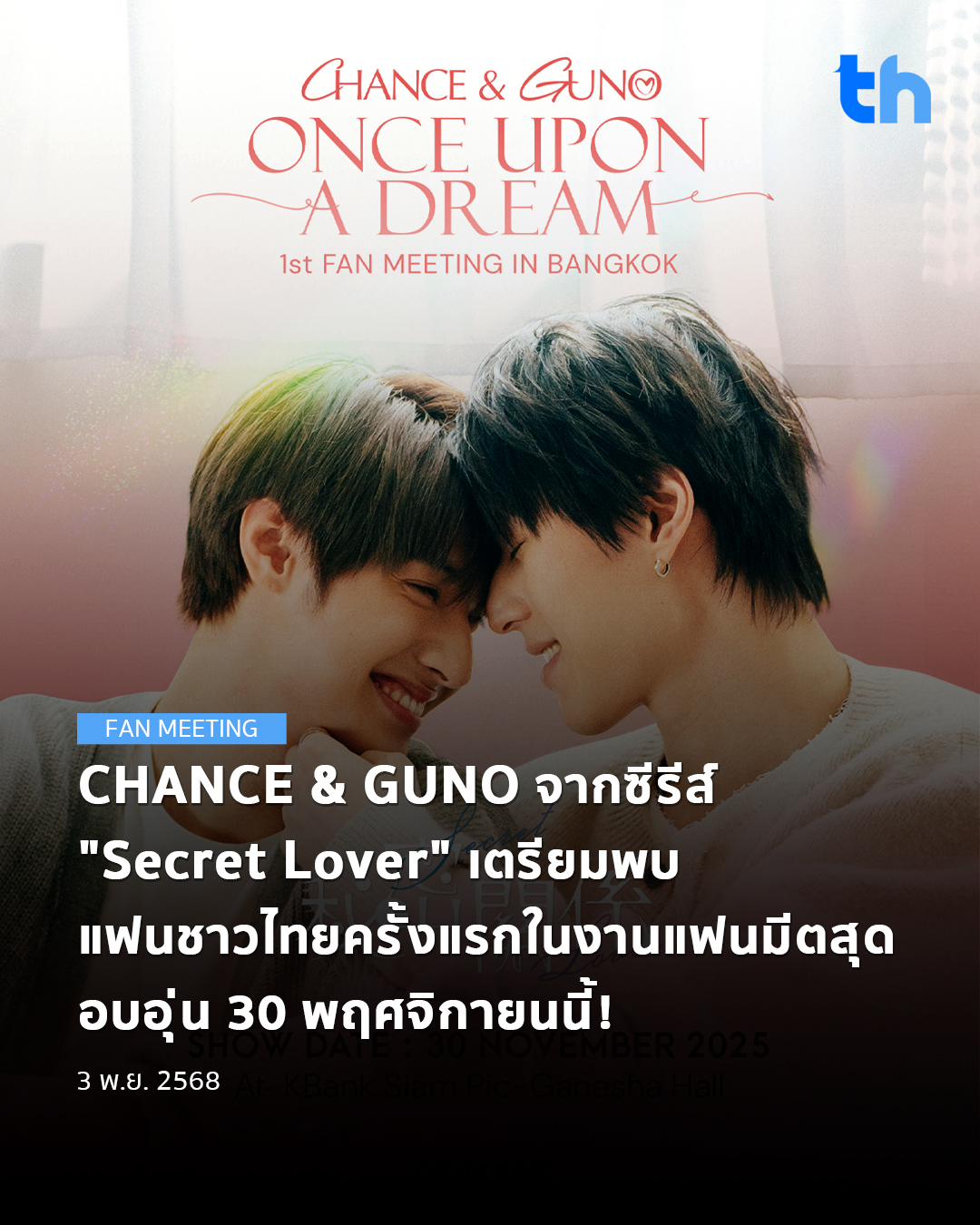 เตรียมหัวใจให้พร้อม! แฟนซีรีส์ “Secret Lover” ห้ามพลาดกับงาน Chance&Guno ONCE UPON A DREAM 1st fan meeting in Bangkok  แฟนมีตติ้งครั้งแรกของทั้ง 2 หนุ่ม Chance และ Guno ในประเทศไทย!