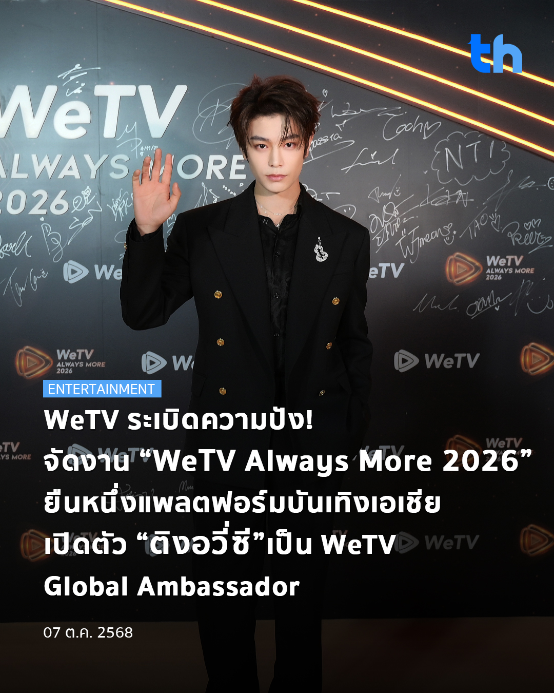 WeTV ประเทศไทยจัดงานสุดยิ่งใหญ่ส่งท้ายปี “WeTV Always More 2026” เปิดตัว “ติงอวี่ซี” (Ding Yuxi) ซูเปอร์สตาร์หนุ่มสุดฮอตจากประเทศจีน ในฐานะโกลบอลแอมบาสเดอร์คนล่าสุดของ WeTV พร้อมประกาศไลน์อัปคอนเทนต์สุดปังทั้งไทยและจีนเสิร์ฟความบันเทิงแบบครบรสจัดเต็มส่งท้ายปี 2025 ต้อนรับปี 2026 นับเป็นปรากฏการณ์สุดยิ่งใหญ่แห่งปี กับการรวมตัวของศิลปิน-นักแสดงชื่อดังกว่า 80 ชีวิต ที่ตบเท้ามาร่วมเฉิดฉายบนพรมส้ม อาทิ เก่ง หฤษฎ์, น้ำปิง นภัสกร, โทมัส ธีร์ทัศน์,ก้อง ก้องภพ, จิมมี่ กานต์, โอม กฤต จาก DOMUNDI มาร์คจิ จิรันธนิน, โอม ฐิติวัฒน์,ปูน มิตรภักดี จาก GMMTV มาย ภาคภูมิ, สน ยุกต์, ยูโร ยศวรรธน์ จาก Be On Cloud, หยิ่น อานันท์, วอร์ วนรัตน์ จาก ARGENTIS เอนจอย ธิดารัตน์, จูน ณัณณิริณ จาก COPY A BANGKOK พร้อมคู่จิ้นตัวท็อป และนักแสดงแถวหน้า แม็กกี้ รชต, บาส หัสณัฐ, อัพ ภูมิพัฒน์, ภูมิ ภูริพันธ์, ฟอร์ด ฐิติพงศ์, พีท วสุธร, เก้า สุภัสสรา, เต้ย พงศกร, คริส หอวัง, รัศมีแข, ธามไท, บูม รวีวิชญ์ และศิลปิน จาก HEADLINER Thailand ที่มาร่วมสร้างสีสันและมอบเซอร์ไพรส์สุดพิเศษให้กับแฟนๆ ได้กรี๊ดกันอย่างสุดเสียง ณ ยูเนียนฮอลล์ 1 ศูนย์การค้ายูเนียนมอลล์