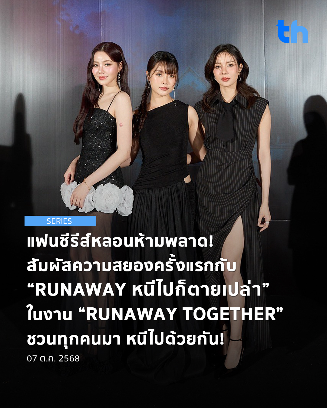 เปิดฉายตอนแรกอย่างเป็นทางการ ซีรีส์แซฟฟิกสยองขวัญเรื่องใหม่ “RUNAWAY หนีไปก็ตายเปล่า” โดย Grow Entertainment ร่วมกับ บ้านฉันProduction บทประพันธ์จาก zonlicht ได้จัดกิจกรรม “RUNAWAY TOGETHER” ชวนทุกคนมา “หนี” ไปด้วยกัน! บรรยากาศภายในงานสุดเข้มข้น ที่ผสมผสานความดาร์กและความหลอนชวนติดตาม นำทีมโดย พงศภัค ฟักเขียว CEO สังกัด Grow Entertainment, อทิติ ชาญเลขา กรรมการผู้จัดการ บ้านฉันProduction, โอ๊ต-วทัญญู อิงควิวัฒน์ ผู้กำกับสายสยองขวัญพร้อมด้วยเหล่านักแสดงนำอย่าง“มิวสิค-แพรวา สุธรรมพงษ์”, “ปลายฟ้า ศิระอาชา”, “เปียโน-ณิชาพัชร์ น้ำทรัพย์อนันต์, “ต้น-ศรัณญ์ อนันตะเศรษฐกูล”, “น็อต-ณัฐสิทธิ์ ปัญญางาม”, “นิว-ปทิตตา อัธยาตมวิทยา” ร่วมด้วย   “ต้อม-รชนีกร พันธุ์มณี”, “โดโด้-ยุทธพิชัย ชาญเลขา”, “แอม-ณัฏฐา ชาญเลขา” และ “ครูน้ำฝน ภักดี” ท่ามกลางแฟนๆ ที่มาร่วมเชียร์และให้กำลังใจกันอย่างเนืองแน่น