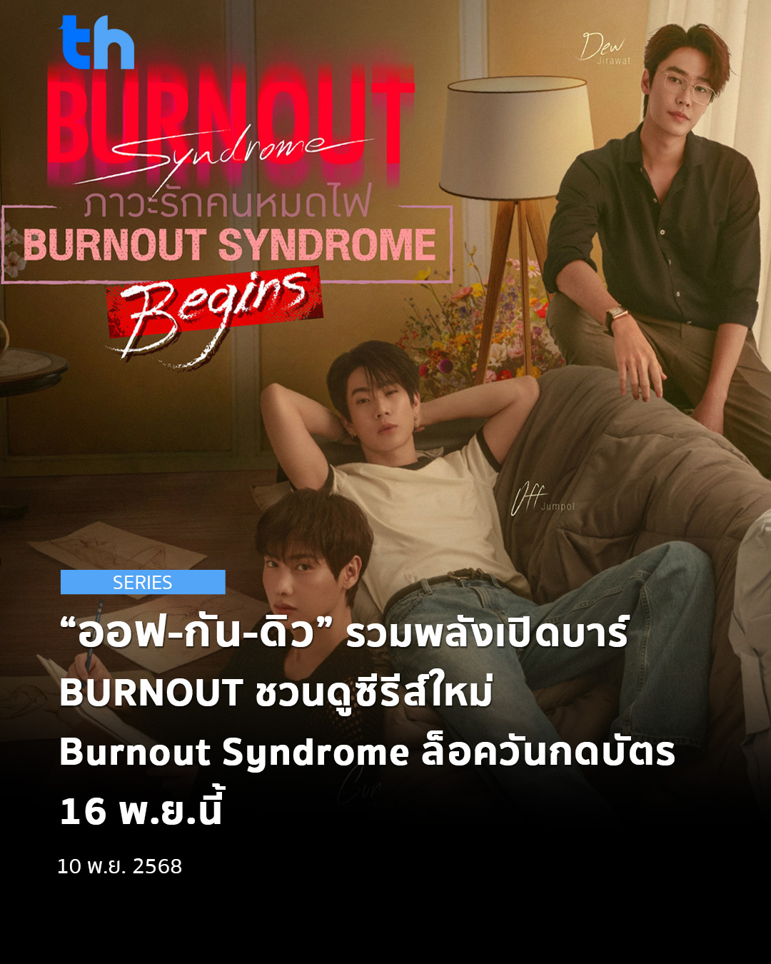 ได้เวลาปลุกไฟในตัวให้ลุกโชน กับซีรีส์เรื่องใหม่ล่าสุด “Burnout Syndrome ภาวะรักคนหมดไฟ” เมื่อเหล่าคน หมดใจ…จุดไฟ รักกัน จาก “GMMTV” คอนเทนต์โพรไวเดอร์ชั้นนำของเมืองไทย กับการพบกันอีกครั้ง ของ 2 นักแสดงคู่ฮอตตลอดกาล “ออฟ จุมพล อดุลกิตติพร” และ “กัน อรรถพันธ์ พูลสวัสดิ์” ที่คราวนี้จับมือ “ดิว จิรวรรตน์ สุทธิวณิชศักดิ์” รวมแก๊งคนหมดไฟ
