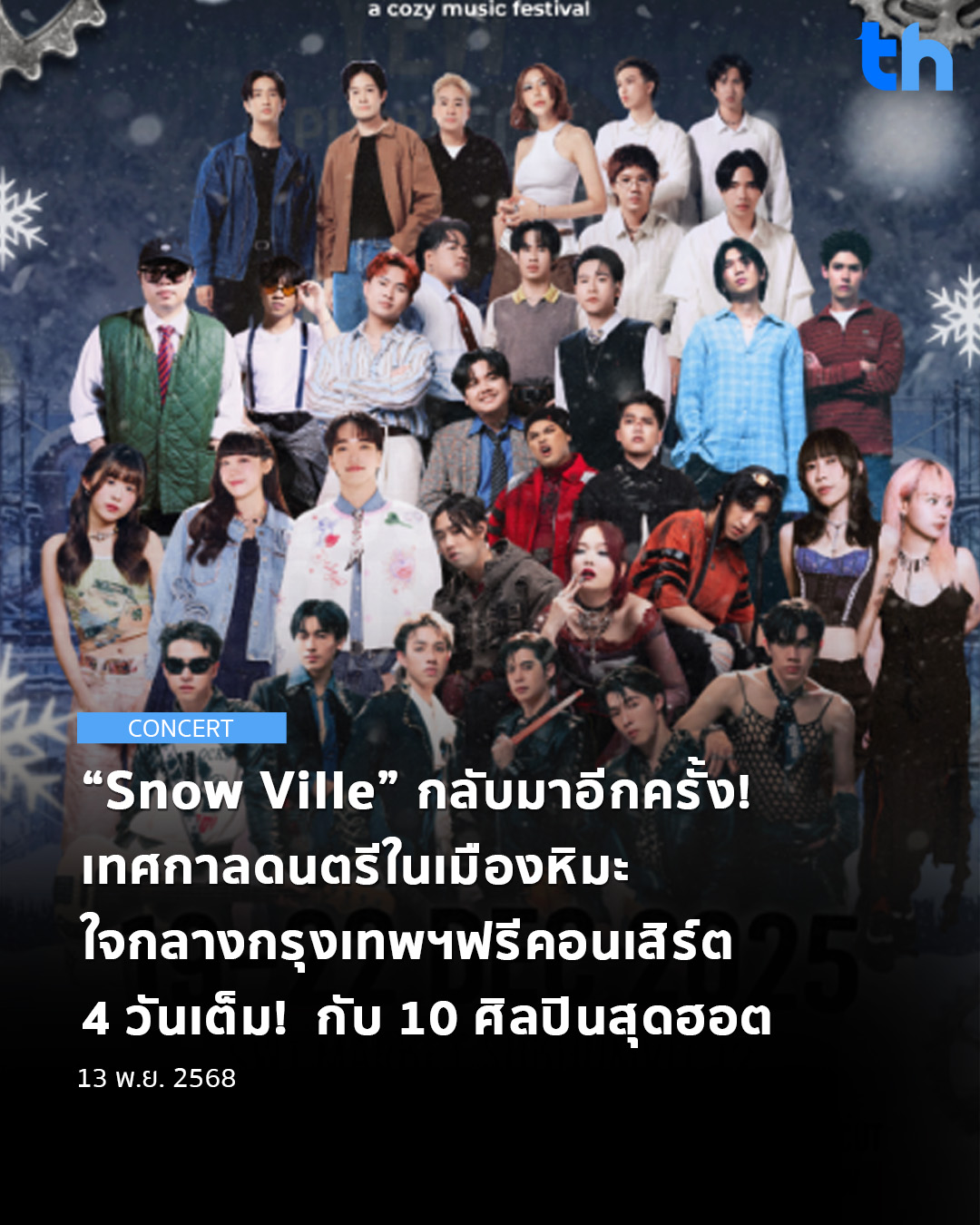 พบกับไลน์อัพ 10 ศิลปิน ที่จะมาสร้างความฟินด้วยเสียงเพลง จัดเต็ม 4 วัน ให้ทุกคนได้อิ่มใจ แฟนๆ เตรียมตัวให้พร้อม! มาร่วมสัมผัสเสียงเพลงและความอบอุ่นให้ฟูลฟีลไปด้วยกันใน “Snow Ville 2025 presented by mMilk” ในวันที่ 19–22 ธันวาคม 2568 ที่ SW1 Market สุขุมวิท 12 ( BTS อโศก ทางออก5 ) เข้าชมฟรี!