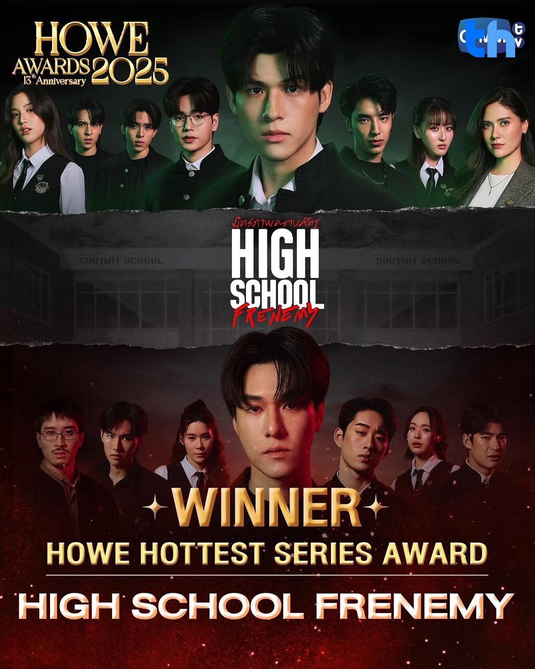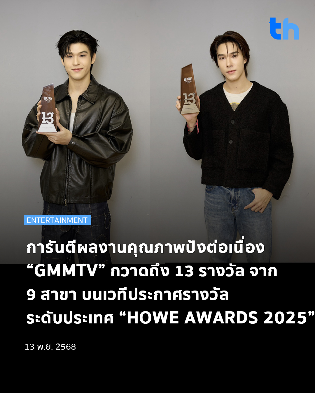สร้างผลงานได้โดดเด่นและยอดเยี่ยมอย่างต่อเนื่อง สำหรับ “GMMTV” คอนเทนต์โพรไวเดอร์ชั้นนำของเมืองไทย ในเครือบริษัท “เดอะ วัน เอ็นเตอร์ไพรส์ จำกัด (มหาชน)” ล่าสุดกวาดถึง 13 รางวัล จาก 9 สาขา ในงานประกาศรางวัลระดับประเทศ “HOWE AWARDS 2025” ครบรอบ 13 ปี จัดโดย นิตยสารฮาว (HOWE MAGAZINE) ซึ่งได้มอบรางวัลให้กับบุคคลอันทรงเกียรติและผู้ประสบความสำเร็จในด้านต่างๆ ทั้งวงการธุรกิจและวงการบันเทิงของประเทศไทย ที่มีผลงานโดดเด่น ยอดเยี่ยม และเป็นที่น่าจับตามองอย่างมาก มอบให้กับบุคคลที่มีชื่อเสียงโดดเด่นในวงการบันเทิงทั้งงานแสดงและด้านดนตรี  รวมทั้งสร้างแรงบันดาลใจให้กับผู้ชมและได้รับการยอมรับจากประชาชน