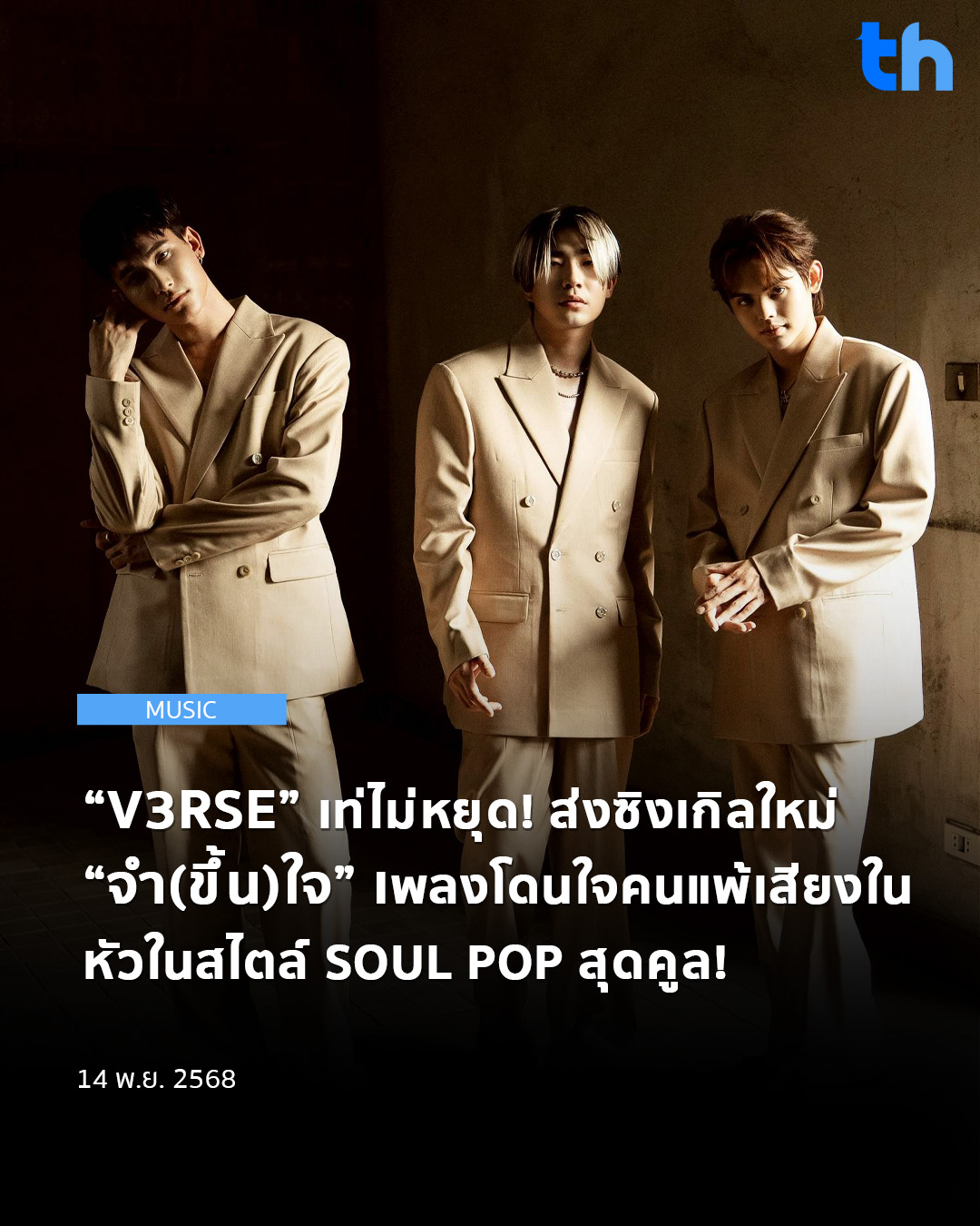 หลังจากปิด EP Album แรกไปพร้อมบรรยากาศสุดอบอุ่นใน Fan Meeting กลางปี 2025 สามหนุ่มโวคอลบอยกรุ๊ป “V3RSE” ได้แก่ “โทรุ ทากิซาว่า, สงกรานต์–จตุพร กล่อมกลิ่นสุข และ พีค–ณฐกร รัตนเพชร” ก็ไม่ปล่อยให้แฟน ๆ ต้องรอนาน กลับมาพร้อมซิงเกิลใหม่ “จำ(ขึ้น)ใจ” เพลงที่เข้าใจคนแพ้เสียงในหัว และตั้งใจให้ทุกคน จำ “V3RSE” ได้ขึ้นใจเช่นกัน