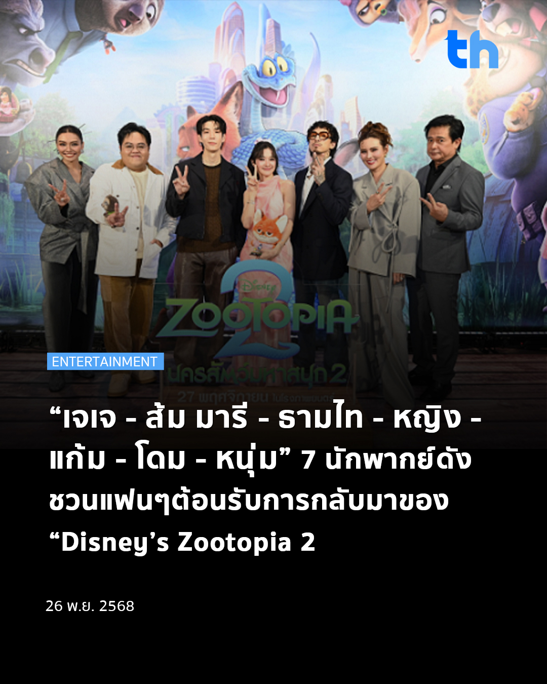 นับเป็นสร้างปรากฏารณ์แห่งปี เมื่อ “Disney’s Zootopia 2 นครสัตว์มหาสนุก 2” จัดงาน Thailand Gala Premiere เปิดตัวในประเทศไทยอย่างยิ่งใหญ่ ยกทัพศิลปิน-นักแสดงชื่อดัง เจเจ กฤษณภูมิ พิบูลสงคราม, ส้ม-มารี เออเจนี เลอเลย์, ธามไท แพลงศิลป์, หญิง-รฐา โพธิ์งาม, แก้ม-วิชญาณี เปียกลิ่น, โดม-จารุวัฒน์ เชี่ยวอร่าม และ หนุ่ม-สันติสุข พรหมศิริ ผู้ร่วมให้เสียงพากย์ภาษาไทยในเรื่อง มาเผยความเป็นแฟนพันธุ์แท้และแชร์ความประทับใจใน Zootopia พร้อมจัดเต็มกิจกรรมสุดหรรษา เนรมิตพื้นที่ SF World Cinema เซ็นทรัล เวิลด์ ให้กลายเป็นนครสัตว์มหาสนุก เพื่อต้อนรับการของภาพยนตร์ภาคต่อที่หลายคนรอคอย ก่อนฉายจริง 27 พฤศจิกายนนี้ โรงภาพยนตร์ทั่วประเทศ