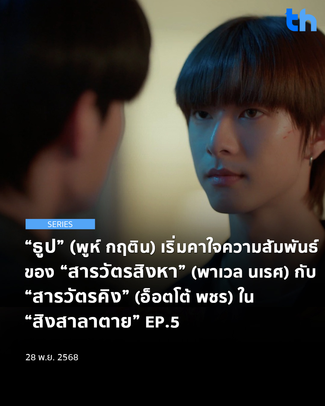 “สิงสาลาตาย” EP.5 เตรียมพาคนดูสู่จุดเปลี่ยนสำคัญ เมื่อ “ธูป” (พูห์ กฤติน) เริ่มรู้สึกได้ถึง ความผิดปกติบางอย่าง ระหว่าง “สารวัตรสิงหา” (พาเวล นเรศ) และ “สารวัตรคิง” (อ็อตโต้ พชร) ความใกล้ชิดที่ดูคุ้นเคยเกินควร การมองตาที่เหมือนมีอะไรซ่อนอยู่ และท่าทีระหว่างทั้งคู่ที่ไม่อาจอธิบายด้วยคำว่า “เพื่อนร่วมงาน”