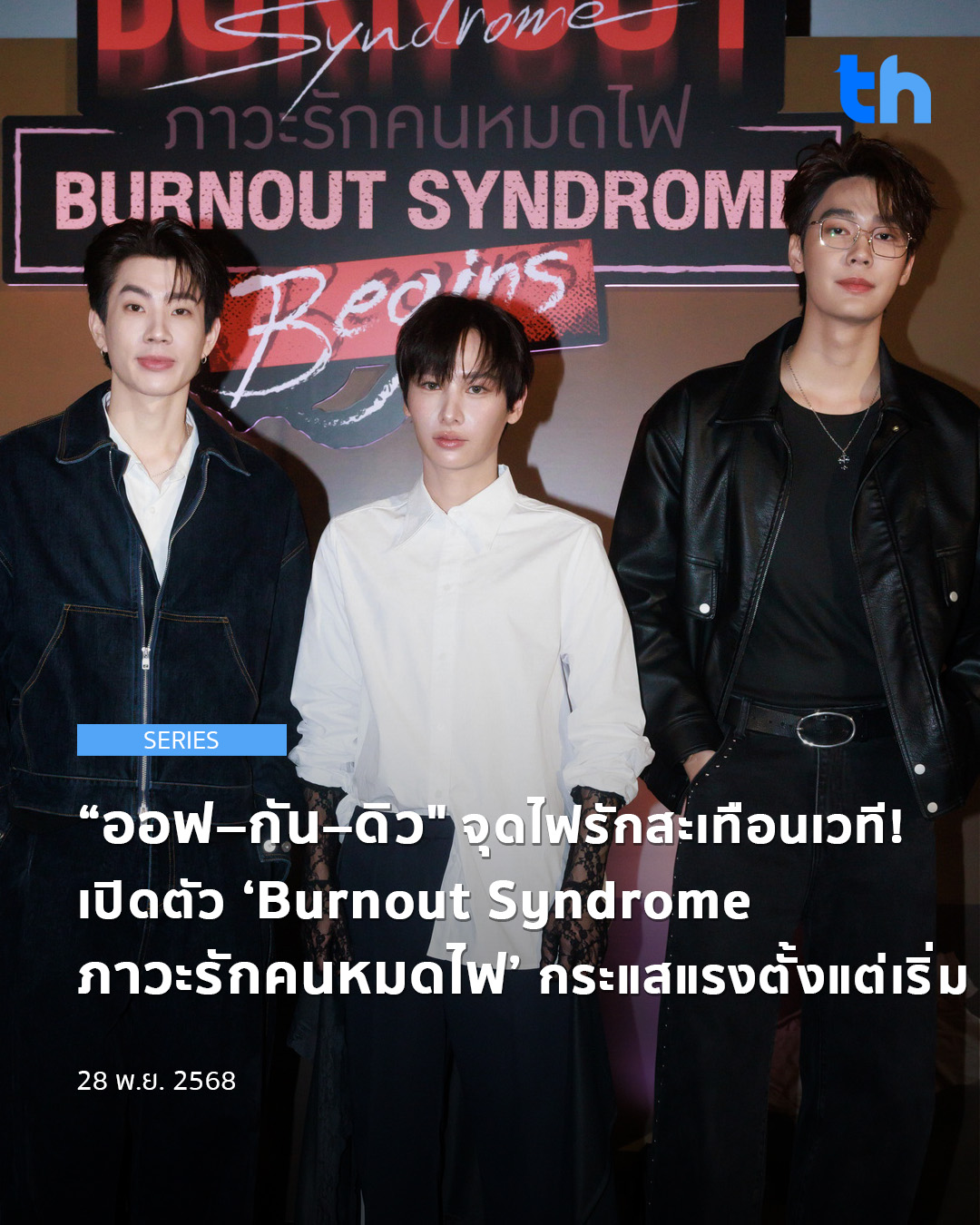 เปิดบาร์ “BURNOUT” ตอนแรกก็จุดไฟแซ่บจนลุกโชน กับซีรีส์เรื่องใหม่ล่าสุด “Burnout Syndrome ภาวะรักคนหมดไฟ” เมื่อเหล่าคนหมดใจ…จุดไฟ รักกัน จาก “GMMTV” คอนเทนต์โพรไวเดอร์ชั้นนำของ เมืองไทย กับการพบกันอีกครั้งของ 2 นักแสดงคู่ฮอตตลอดกาล “ออฟ จุมพล” และ “กัน อรรถพันธ์” ที่คราวนี้จับมือหนุ่มฮอต “ดิว จิรวรรตน์” รวมแก๊งคนหมดไฟ ทำเอาแฟน ๆ นั่งจิกเบาะทั้งลุ้นและเคลิ้มไปกับลีลาของ 3 หนุ่มที่แข่งกันเต๊าะ และ อ่อย กันตลอดเรื่องว่าใครจุดไฟเก่งกว่ากัน ในงาน “Burnout Syndrome Begins”