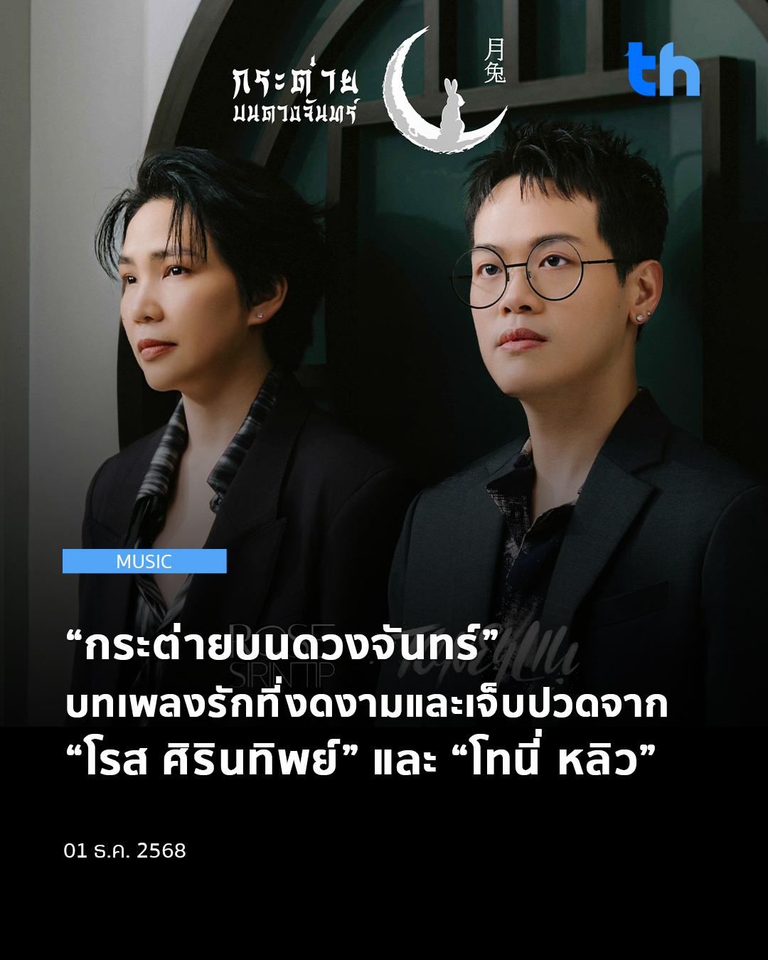 หลังจากเคยร่วมงานกันในเพลง “ไออุ่นต้องห้าม” ที่ได้รับกระแสตอบรับอย่างอบอุ่นจากแฟนเพลง สองศิลปินคุณภาพ โรส ศิรินทิพย์ และ โทนี่ หลิว กลับมาร่วมสร้างสรรค์ผลงานอีกครั้ง ในซิงเกิลใหม่ล่าสุด “กระต่ายบนดวงจันทร์” บทเพลงรักที่สะท้อน “ความรักแบบเสียสละ” ความรักที่อาจไม่ได้ครอบครอง แต่ยังคงอยู่ในหัวใจเสมอ