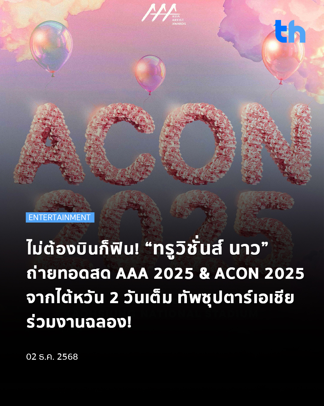 แฟนคลับชาวไทยปักหมุดไว้ให้พร้อม ในวันที่ 6 – 7 ธันวาคม 2568 นี้ พบกันงานประกาศรางวัลสุดยิ่งใหญ่แห่งเอเชีย AAA 2025 เอเชีย อาร์ทิสต์ อวอร์ดส์ 2025 (10th Anniversary Asia Artist Awards 2025) และเทศกาลดนตรีสุดปัง ACON 2025 จัดแบบยิ่งใหญ่ไฟกระพริบ ณ สนามกีฬาแห่งชาติเกาสง ไต้หวัน ซึ่งลูกค้า ทรูวิชั่นส์ นาว (TrueVisions NOW) จะได้รับชมความอลังการนี้แบบเอ็กซ์คลูซีฟขั้นสุด ผ่านการถ่ายทอดสดที่เดียวในประเทศไทย