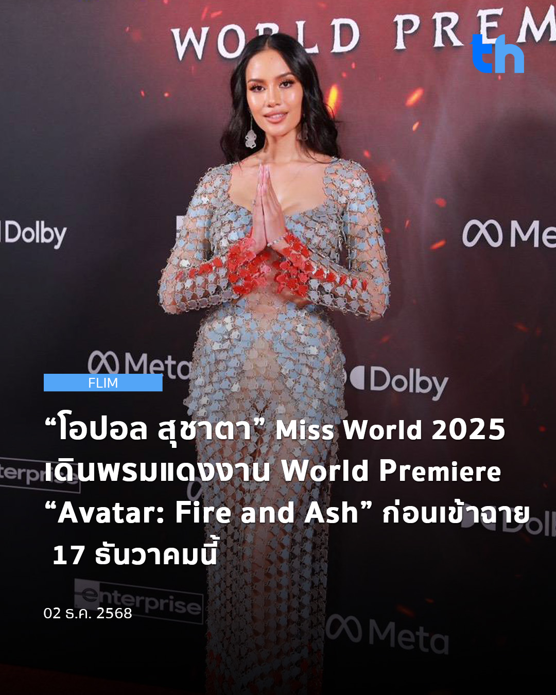 เรียกเสียงฮือฮาและสร้างความตื่นเต้นให้กับแฟนภาพยนตร์ Avatar รวมถึงแฟน Miss World เป็นอย่างมาก เมื่อ โอปอล-สุชาตา ช่วงศรี Miss World 2025 ปรากฏกายในงาน World Premiere เปิดตัวภาพยนตร์ “Avatar: Fire and Ash อวตาร: อัคนีและธุลีดิน ในฐานะตัวแทนเพียงหนึ่งเดียวจากประเทศไทยที่ได้รับเชิญให้เข้าร่วมงาน