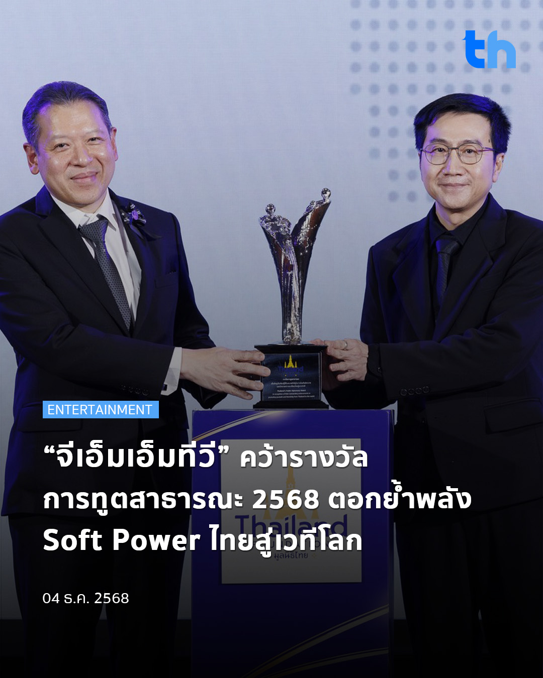 สร้างความภาคภูมิใจอย่างยิ่งให้กับคณะผู้บริหาร พนักงาน และนักแสดงทุกคน สำหรับ “บริษัท จีเอ็มเอ็มทีวี จำกัด” คอนเทนต์โพรไวเดอร์ชั้นนำของเมืองไทย ในเครือบริษัท “เดอะ วัน เอ็นเตอร์ไพรส์ จำกัด (มหาชน)” ที่ได้รับมอบ “รางวัลการทูตสาธารณะ” ประจำปี 2568 (Thailand’s Public Diplomacy Award 2025 – TPDA2025)