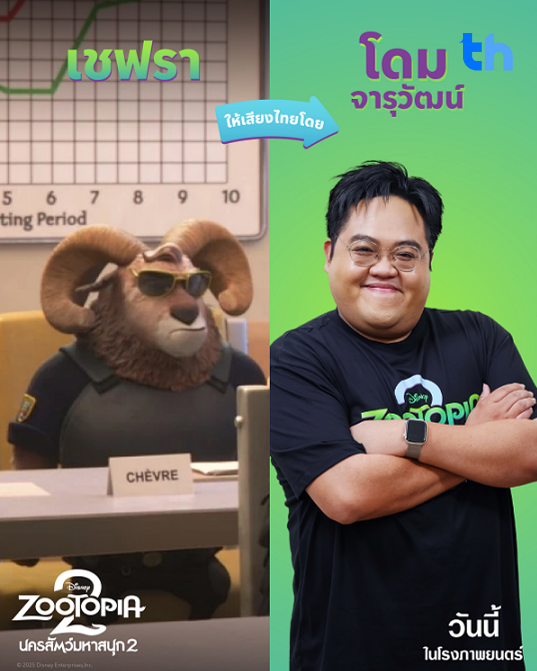 โดม จารุวัฒน์ ให้เสียงเป็น “เชฟรา” (Chevre) แพะตัวผู้สุดดุดันที่ทำงานให้กับ กรมตำรวจซูโทเปีย ร่วมกับคู่หู เจ้าหน้าที่บูเชอรอน (Bûcheron)