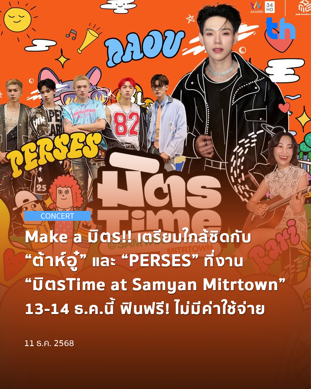 เตรียมตัวให้พร้อม!! แล้วมาพบกับเทศกาลส่งท้ายปลายปี “มิตรTime at Samyan Mitrtown” ที่จะมาพร้อมกับมินิคอนเสิร์ตของเหล่าศิลปินสุดฮอตขวัญใจชาวมิตรTime อย่าง 5 หนุ่มบอยแบนด์สุดฮอต “PERSES” พร้อมด้วยหนึ่งหนุ่มพลังเหลือล้น “ต้าห์อู๋ พิทยา” และ “RARI” สาวเท่เสียงใสจากค่าย HOLY FOX วันที่ 13-14 ธันวาคม 2568 งานนี้ Make a มิตรฟรี!! ไม่มีค่าใช้จ่าย