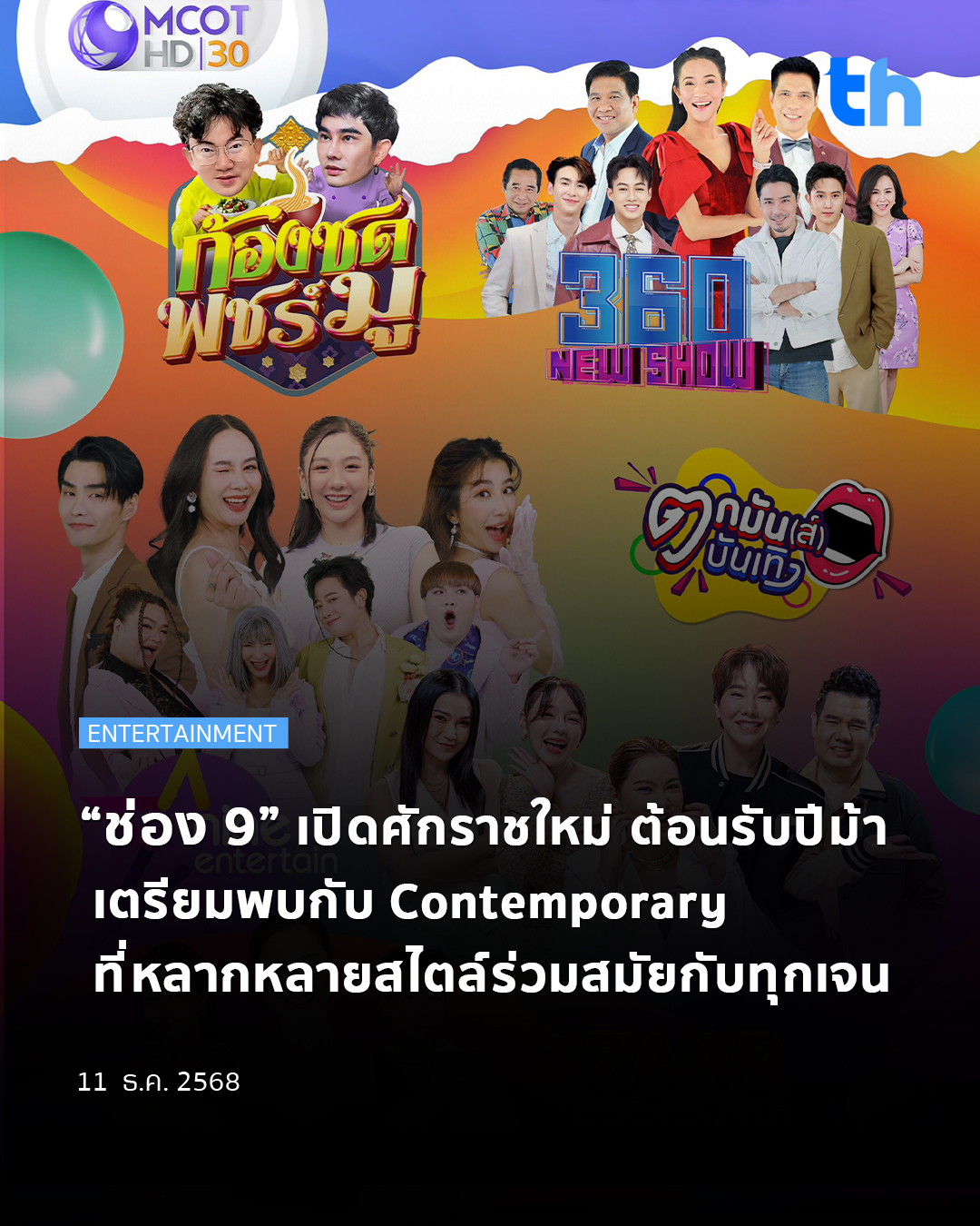“คุณวีรยุทธ แก้วจินดา” ผู้อำนวยการช่อง 9 MCOT HD เผยว่า “เตรียมพบกับ Contemporary ที่หลากหลายสไตล์ที่ช่อง 9 ซึ่งเราจัดสรรมาให้แฟนหน้าจอเพียบครับ เริ่มที่รายการวาไรตี้บันเทิง ยอดนิยม พบกับรายการ 360 องศา New Show (Live) ดำเนินรายการโดย “ธนินวัฒน์ พัฒนวีรคุณ, ดร.วีรินทร์ทิรา, รศ.ดร.ธนวรรธน์ นาทองบ่อจรัส, ปอ-อรรณพ, เชน-ธวัชสรรค์, คำรณ หว่างหวังศรี, ปุ๊-พัชริญภรณ์, ศรุญศธร ธนวัชรวัฒน์, ชวิน ลิขิตเจริญสกุล”