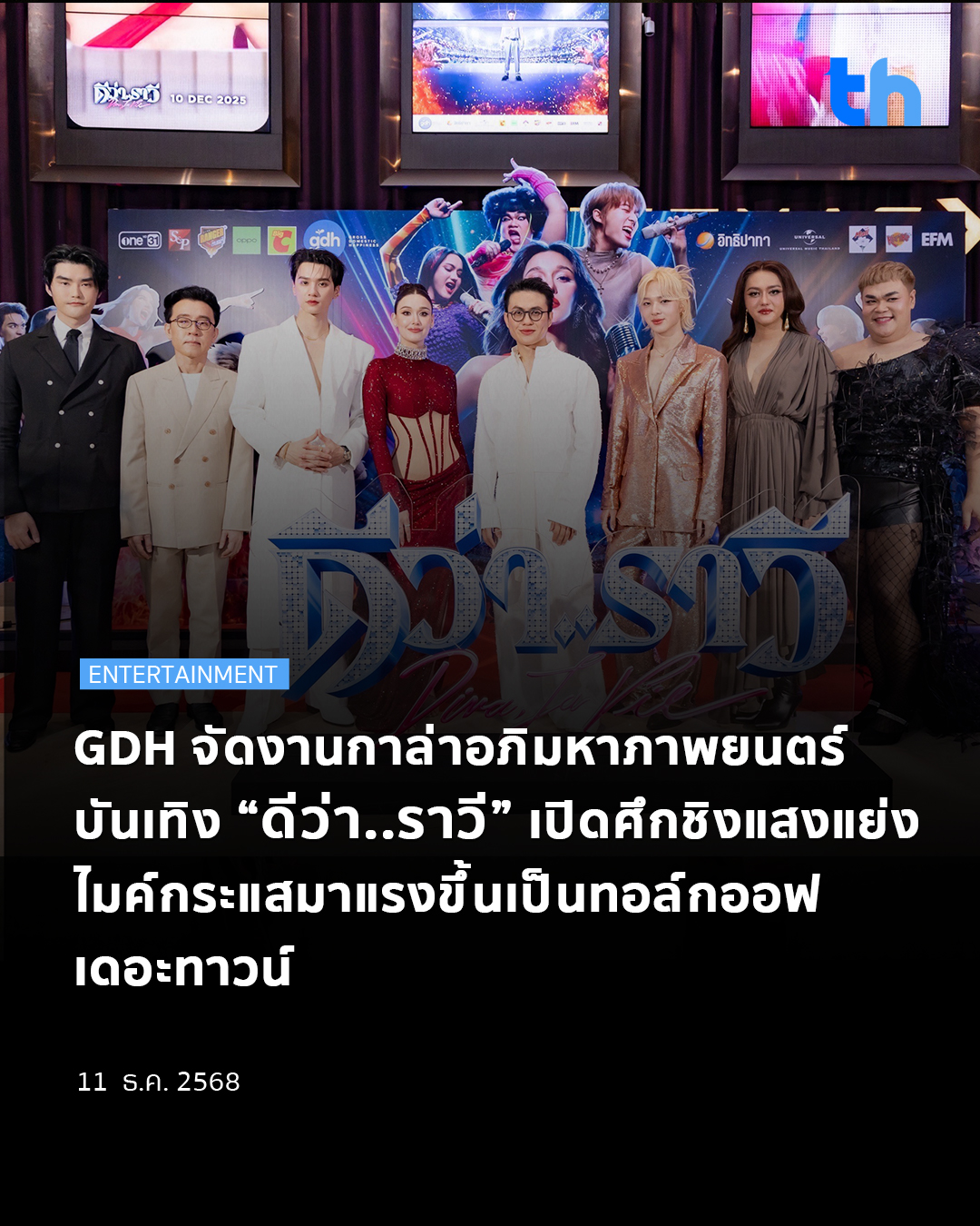 อภิมหาความบันเทิงได้ฤกษ์เปิดฉากอย่างเป็นทางการ เมื่อ GDH จัดงานกาล่าภาพยนตร์ “ดีว่า..ราวี” ขึ้นอย่างยิ่งใหญ่ในวันแรกที่หนังเข้าฉาย จนกลายเป็นกระแสทอล์กออฟเดอะทาวน์สนั่นโซเชียล ภาพยนตร์เรื่องนี้บอกเล่าเรื่องราวการห้ำหั่นกลางสมรภูมิคอนเสิร์ตระหว่างนักร้องสองเจเนอเรชั่น โดยมี “ปลายฝัน” ดีว่าสองล้านตลับที่กลับมาจับไมค์อีกครั้ง เพื่อพิสูจน์ความเก๋าเกมของตัวเอง ขณะที่อีกฝั่งคือ “แก๊งตาคลี” แก๊งไอดอลผู้ทรงอิทธิพลของวัยรุ่น GEN Z ที่กำลังมาแรงในกลุ่มแฟนเพลงรุ่นใหม่ นำแสดงโดย แจ็คกี้-ชาเคอลีน มึ้นช์, ปิงปอง-ธงชัย ทองกันทม, นินิว เพชรด่านแก้ว และ นุนิว-ชวรินทร์ เพริศพิริยะวงศ์ พร้อมเสริมทัพด้วย เก่ง-หฤษฎ์ บัวย้อย, บ็อบบี้-นิมิตร ลักษมีพงศ์ และ เต๋อ-รัฐนันท์ จรรยาจิรวงศ์