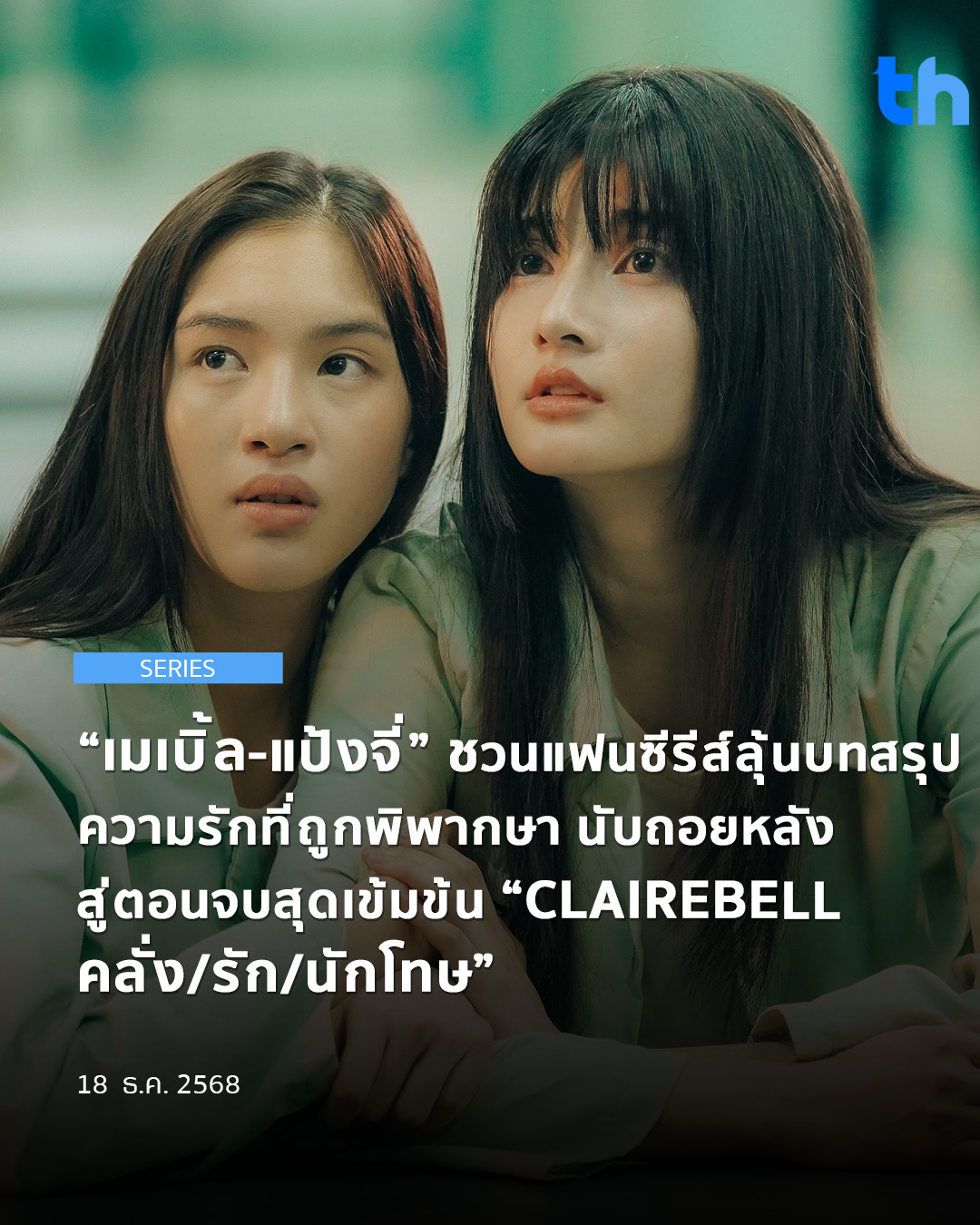 เข้มข้นถึงขีดสุดพบกับตอนจบของซีรีส์แซฟฟิก “CLAIREBELL คลั่ง/รัก/นักโทษ” จากค่าย Mine Media Production ออกอากาศทางช่องวัน31 ผลงานคุณภาพที่สร้างเสียงฮือฮา จนกลายเป็นไวรัลอย่างต่อเนื่อง ล่าสุดชวนเเฟน ๆ มาลุ้นกับบทสรุประหว่าง “แคลร์” (เมเบิ้ล-สิริวลี สิริวิบูลย์) , “เบล” (แป้งจี่-ปภาวรินท์ สวัสดิเวช)  เตรียมนับถอยหลังสู่จุดระเบิด ความลับที่ถูกปิดซ่อนมานาน  งานนี้ทุกตัวละครต้องเผชิญความจริงที่ไม่มีทางถอย เเละอาจจะกลายเป็นโศกนาฏกรรมที่ไม่คาดฝัน!! ห้ามพลาดชมเด็ดขาด