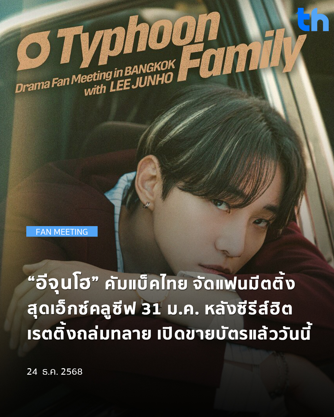 ล่าสุด SOLE U ENTERTAIN (โซลยูว์ เอ็นเตอร์เทน) ขอมอบของขวัญพิเศษต้อนรับปี 2026 ด้วยการประกาศจัดงานแฟนมีตติ้งของ “อีจุนโฮ” อีกครั้งอย่างยิ่งใหญ่ กับงาน “Typhoon Family Drama Fan Meeting in Bangkok with LEE JUNHO”พร้อมเสิร์ฟประสบการณ์สุดพิเศษ ที่แฟน ๆ จะได้ใกล้ชิดกับอีจุนโฮมากกว่าที่เคย รวมถึงเซอร์ไพรส์ที่เตรียมมาเพื่อแฟนโดยเฉพาะ โดยจะจัดขึ้นในวันเสาร์ที่ 31 มกราคม 2026