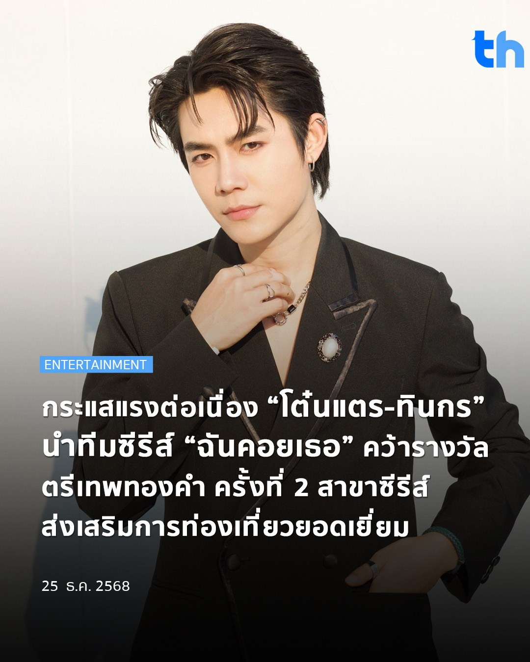 นอกจากซีรีส์จะทำงานหนักแล้ว หนุ่มโต๋นเองก็ไม่แผ่วเดินสายโปรโมท เดินสายมูสุดพลัง หวังให้ซีรีส์ปังและเป็นที่รู้จักและดูเหมือนว่าจะทำถึงและทุกอย่างจะเป็นใจ เพราะล่าสุดซีรีส์เรื่องดังกล่าวคว้ารางวัล ซีรีส์วายส่งเสริมการท่องเที่ยวยอดเยี่ยม จากงานประกาศรางวัล ตรีเทพทองคำ ครั้งที่ 2 ประจำปี 2568 เมื่อวันอาทิตย์ที่ 21 ธันวาคม ที่ผ่านมา ณ Phenix Auditorium Hall, ประตูน้ำ กรุงเทพฯ จัดโดยชมรมผู้สื่อข่าวออนไลน์ (Online Journalists Club) ร่วมกับพันธมิตรด้านสื่อมวลชน งานนี้เจ้าตัวแท็กทีมนักแสดงขึ้นรับรางวัลอีกด้วย