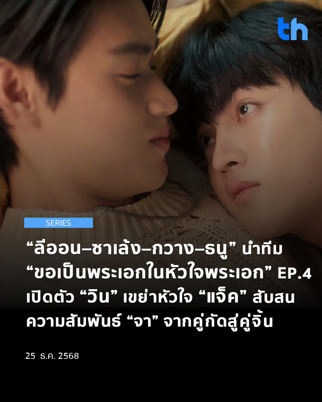 “ลีออน–ซาเล้ง–กวาง–ธนู” นำทีม “ขอเป็นพระเอกในหัวใจพระเอก” EP.4 เปิดตัว “วิน” เขย่าหัวใจ “แจ็ค” สับสนความสัมพันธ์ “จา” จากคู่กัดสู่คู่จิ้น25/12/2025