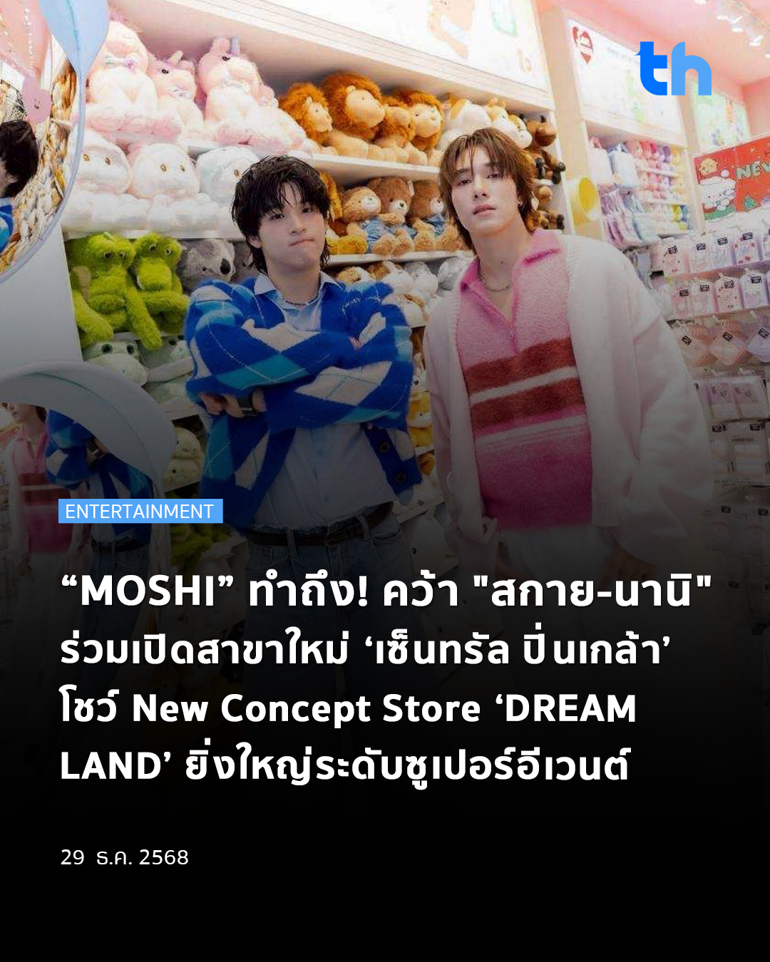 ‘บมจ. โมชิ โมชิ รีเทล คอร์ปอเรชั่น’ หรือ MOSHI ร้านค้าปลีกสินค้าไลฟ์สไตล์ชั้นนำสัญชาติไทย สร้างปรากฏการณ์ความสุขส่งท้ายปี 2568 เฉลิมฉลองเปิดตัวร้าน Moshi Moshi สาขาใหม่ ในรูปแบบ New Concept Store ‘DREAMLAND’ เซ็นทรัล ปิ่นเกล้า ปักหมุดสาขาที่ 196 เนรมิตพื้นที่ให้กลายเป็นดินแดนแห่งความฝัน พร้อมเซอร์ไพรส์ใหญ่คว้าตัวสองหนุ่มสุดฮอต “สกาย-วงศ์รวี” และ “นานิ-หิรัญกฤษฎิ์” มาร่วมสร้างโมเมนต์สุด Exclusive ทำเอาเหล่าแฟนคลับฟินกระจายห้างแตกส่งท้ายปี