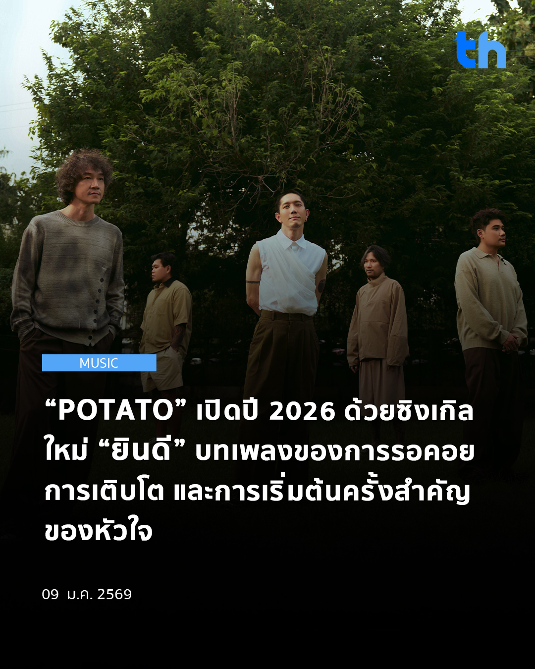 ต้อนรับการเริ่มต้นปี 2026 ด้วยบทเพลงที่อบอวลไปด้วยความหวังและความหมาย วงร็อกขวัญใจมหาชน “POTATO” จากค่าย genie records กลับมาพร้อมซิงเกิลใหม่ล่าสุด “ยินดี” เพลงช้าอบอุ่นที่ชวนให้หัวใจค่อยๆ เดินทางไปสู่ช่วงเวลาแห่งการรอคอย การเติบโต และการเปิดรับสิ่งใหม่ที่กำลังจะเข้ามาในชีวิต