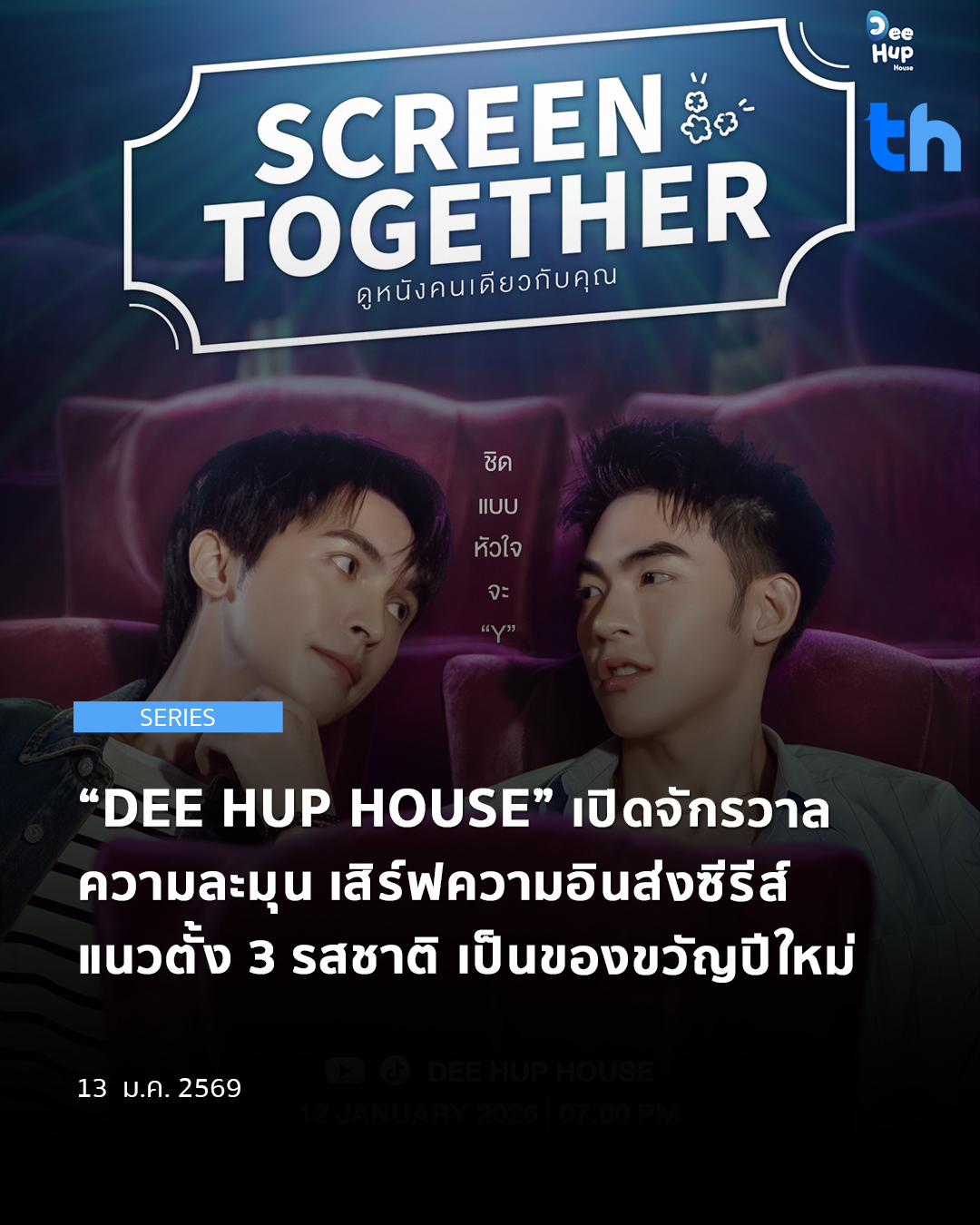 “SCREEN TOGETHER ดูหนังคนเดียวกับคุณ – LOVE TRUCK รักสองแถว – INFLULOVER ไลฟ์ดีนัก รักดีมั้ย” เสิร์ฟฟินสาววายรับศักราชใหม่ เริ่ม 12 ม.ค.นี้ ที่ YouTube และ TikTok ของทาง DEE HUP HOUSE