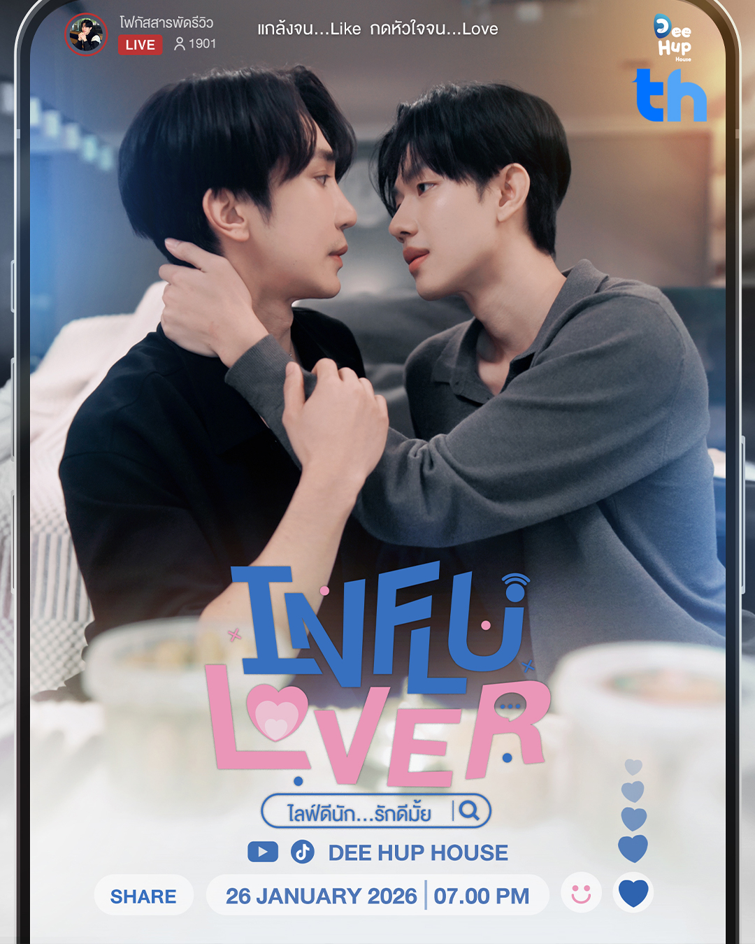ปิดท้ายด้วยผลงานการกำกับของมือตัดต่อแห่งบ้าน Dee Hup House สหรัฐ คงวัฒนาถาวร ที่ผันตัวมานั่งเก้าอี้ผู้กำกับ ซีรีส์ที่มีชื่อว่า INFLULOVER ไลฟ์ดีนัก รักดีมั้ย เรื่องนี้อินฟลูอินใจ สาวกโซเชียลทั้งหลายห้ามพลาด “ใครจะคิดว่ารูมเมตของผมจะทำ…แบบนี้กับผมกลางไลฟ์” คอนเฟิร์มว่าฟินหนักมากสำหรับความสัมพันธ์ของ “เจตน์ กับ โฟกัส” ที่รับบทโดย “ไกด์-กันตพล ชมภูพันธ์” หนุ่มหล่อสายเฟรนลี่ ปะทะ “เดช-ณรงค์เดช รุ่งอรุณ” หนุ่มรักสงบรีวิวเลิฟเวอร์ เมื่อคนต่างขั้วมาเจอกันความฟินจึงบังเกิด 26 มกราคมนี้ รู้กัน !