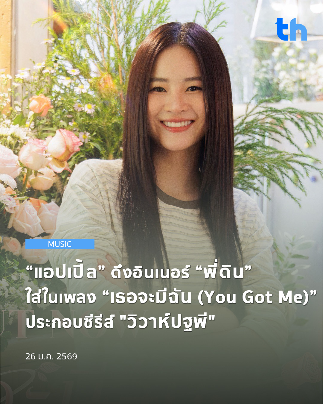 ติดตามฟังเสียงร้องสุดละมุนของ “แอปเปิ้ล” ในเพลง “เธอจะมีฉัน (You Got Me)” ประกอบซีรีส์ วิวาห์ปฐพี ได้ทุก Music Streaming พร้อมรับชม Music Video ได้ทาง YouTube : NORTH STAR ENTERTAINMENT
