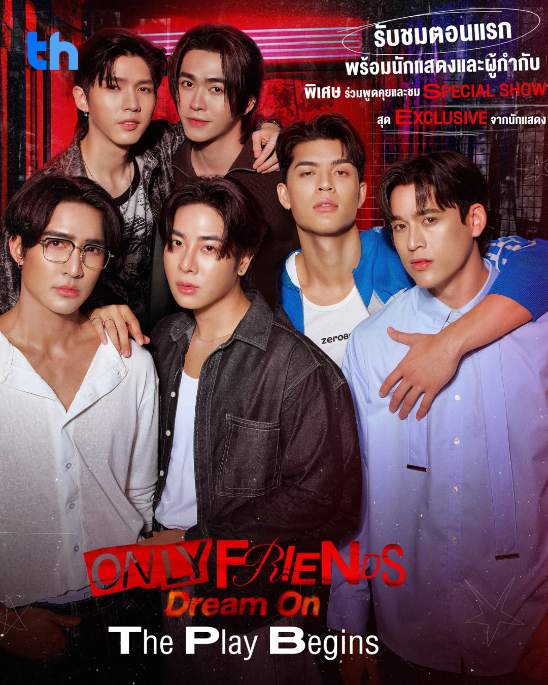 เตรียมเปิดม่านการแสดงกับโปรเจกต์ละครเวทีคณะจาก 6 หนุ่มฮอตสุดแซ่บ “เอิร์ท พิรพัฒน์ วัฒนเศรษสิริ, มิกซ์ สหภาพ วงศ์ราษฎร์, จอส เวอาห์ แสงเงิน, กวิน แคสกี้, อู๋ ธนบูรณ์ เกียรตินิรันดร์, บูม ธราธร จันทรวรกาญจน์” ที่แท็กทีมกันอย่างแซ่บซี๊ดถึงใจ รวมถึงถ่ายทอดความสัมพันธ์รักสุดเร่าร้อนที่ 6 หนุ่มขอเปิดเวทีครั้งใหญ่ชวนแฟน ๆ มาสร้างโมเมนต์สุดพิเศษร่วมกัน พร้อมกับร่วมดูตอนแรกซีรีส์ “Only Friends : Dream On” เล่นกับเพื่อนได้…มากกว่าเพื่อน จาก “GMMTV” คอนเทนต์โพรไวเดอร์ชั้นนำของเมืองไทย