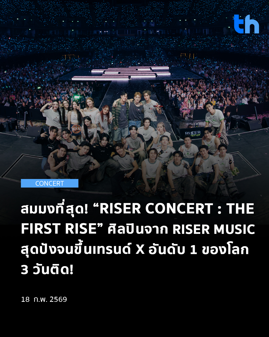 ขนเพลงฮิต พร้อมโชว์สุดพิเศษใส่สุดใส่เต็มมอบให้กับแฟนๆ ตลอดกว่า 5 ชั่วโมง จนทำให้กระแสโซเชียลทั่วโลกร้อนแรง ส่งผลให้แฮชแท็ก #RISERCONCERTD1, #RISERCONCERTD2, #RISERCONCERTD3 ทะยานขึ้นเทรนด์ “อันดับ 1” บน X Worldwide, ประเทศไทย และในอีกหลายพื้นที่ทั่วโลก รวมถึงอันดับอื่นๆ ในหลายพื้นที่ทั่วโลก 3 วันติด สร้างความประทับใจให้กับแฟนๆ ทั้งในอิมแพ็ค อารีน่า และที่รับชมแบบ Live Streaming ผ่านทาง “TTM LIVE” ที่สามารถครอบคลุมทั่วโลก เมื่อวันที่ 13-15 กุมภาพันธ์ 2569 ที่ผ่านมา ณ อิมแพ็ค อารีน่า เมืองทองธานี