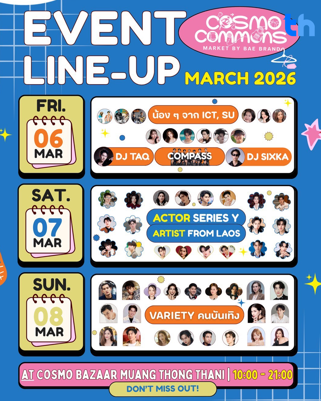 วันอาทิตย์ที่ 8 มีนาคม: ธีม “Sunday Variety” เสิร์ฟความบันเทิงจากพ่อค้าแม่ค้า นักแสดง และอินฟลูเอนเซอร์ พร้อมปิดท้ายด้วยมินิคอนเสิร์ตจาก “บิ๊ก ทองภูมิ” และ “ซีแนม AF” ที่จะมามอบความสนุกแบบใกล้ชิด