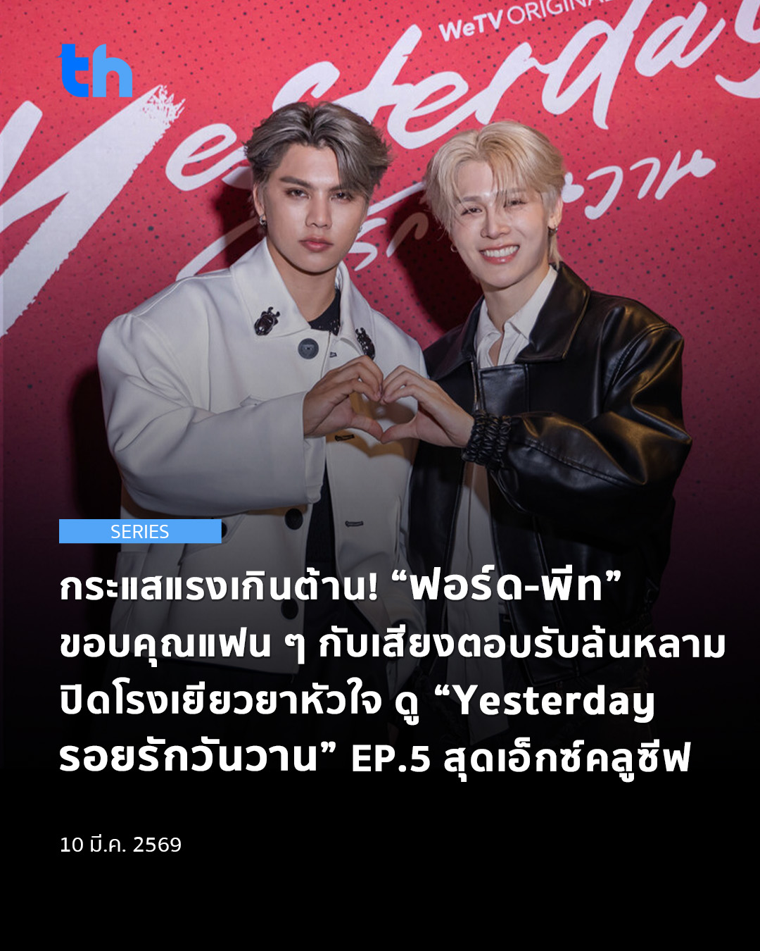 ตอกย้ำปรากฏการณ์ “เวียร์-เคลวิน” ฟีเวอร์ ไปกับซีรีส์ที่เจ็บที่สุดแห่งปี WeTV Original “Yesterday รอยรักวันวาน” หลังได้รับกระแสตอบรับอย่างล้นหลามจากแฟน ๆ ทั้งในไทย พร้อมสร้างสถิติขึ้นแท่นซีรีส์วายอันดับ 1 บนแอป WeTV ทุกครั้งที่ออกอากาศ ล่าสุดสองนักแสดงนำ “ฟอร์ด ฐิติพงศ์” และ “พีท วสุธร” ปิดโรงภาพยนตร์รวมแฟน ๆ มาร่วมเยียวยาความเจ็บไปกับเรื่องราวสุดเข้มข้นของ EP.5 แบบใกล้ชิด ในงาน “Yesterday รอยรักวันวาน EP.5 Screening with Fort-Peat Presented by TROFI & CUSP” ซึ่งจัดขึ้นเมื่อวันที่ 2 มีนาคม 2569 ณ Major Cineplex Ratchayothin โรงที่ 13 ท่ามกลางสื่อมวลชนและแฟน ๆ ที่มาร่วมงานอย่างคับคั่ง