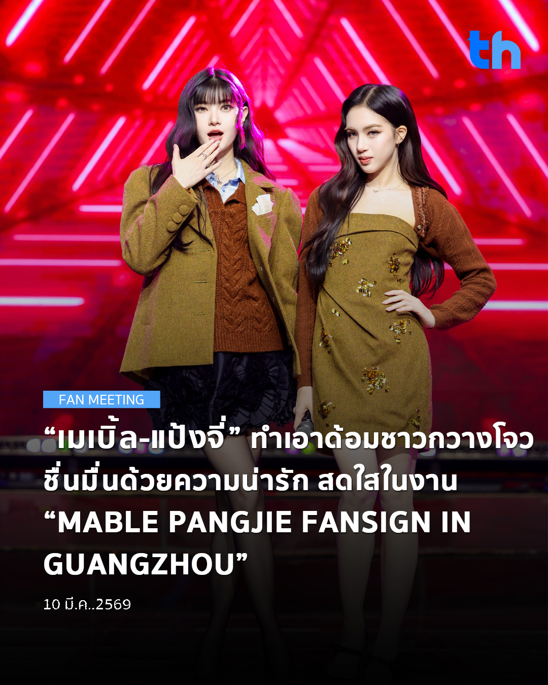“เมเบิ้ล” และ “แป้งจี่” สร้างความประทับใจให้แฟนคลับอย่างล้นหลามในงาน MABLE PANGJIE FANSIGN IN GUANGZHOU ซึ่งจัดขึ้นเมื่อวันที่ 7 มีนาคม 2569 ณ เมือง กวางโจว บรรยากาศสุดน่ารักและสร้างความประทับใจไปไม่น้อย
