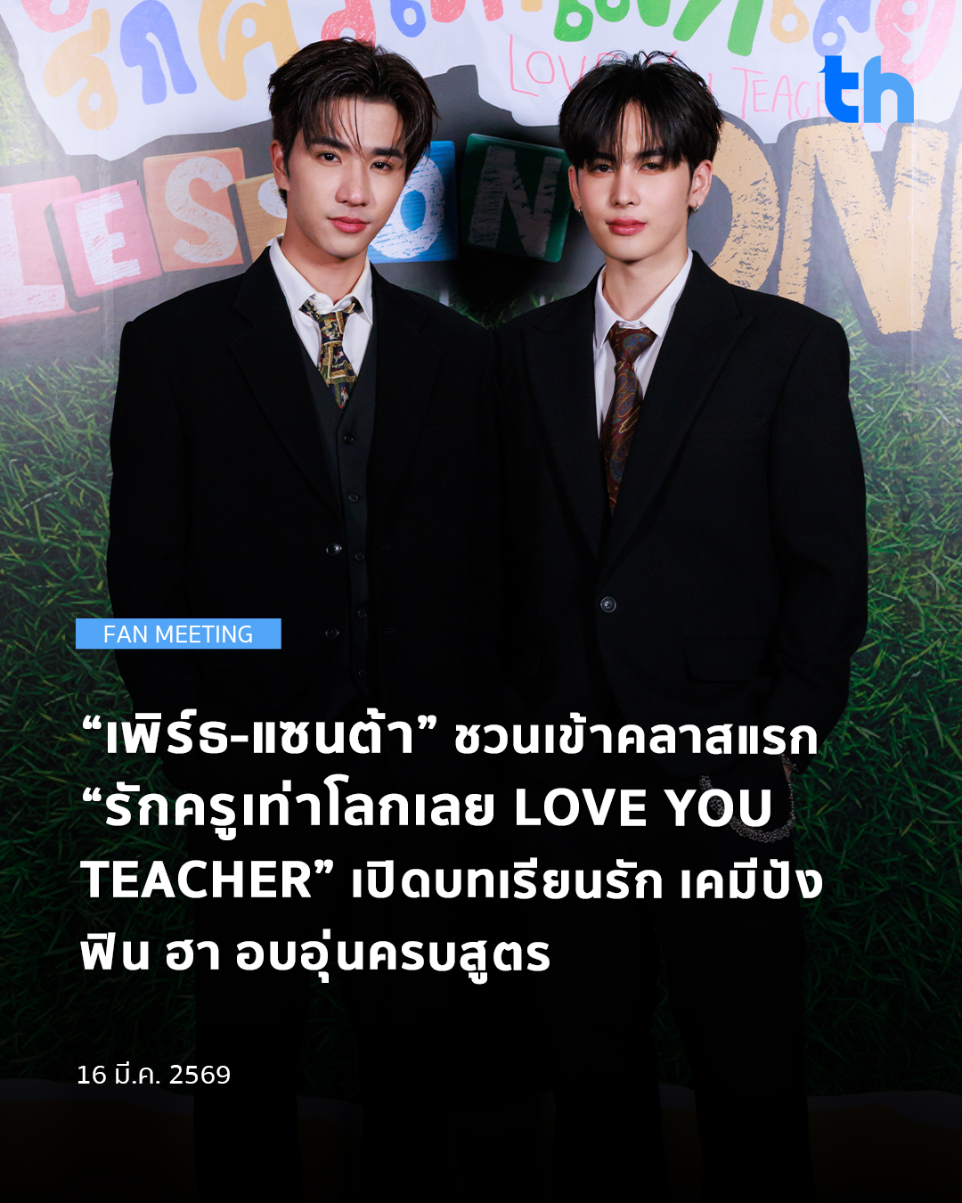 กอดคอเปิดบทเรียนรัก ที่เรียกความฮาทุกคลาสสนุกทุกคาบ จนแฟน ๆ พร้อมใจกันสัญญาว่าจะเข้าเรียนทุกคลาส ในงาน “รักครูเท่าโลกเลย Lesson One” ร่วมด้วยผู้กำกับฯ มากฝีมือ “โดม จารุพัฒน์ กันนุลา” ที่มาร่วมพูดคุยถึงเบื้องหน้าเบื้องหลังการทำงาน และพิเศษสุดๆ กับสเปเชียลโชว์สุดเอ็กซ์คลูซีฟจาก “เพิร์ธ-แซนต้า” ท่ามกลางโมเมนต์ฟิน ๆ มามอบให้แฟน ๆ แบบเต็มอิ่ม เมื่อวันเสาร์ที่ 14 มีนาคม 2569 เวลา 19.30 น. ที่ ภิรัชฮอลล์ ไบเทค บางนา ที่ผ่านมา