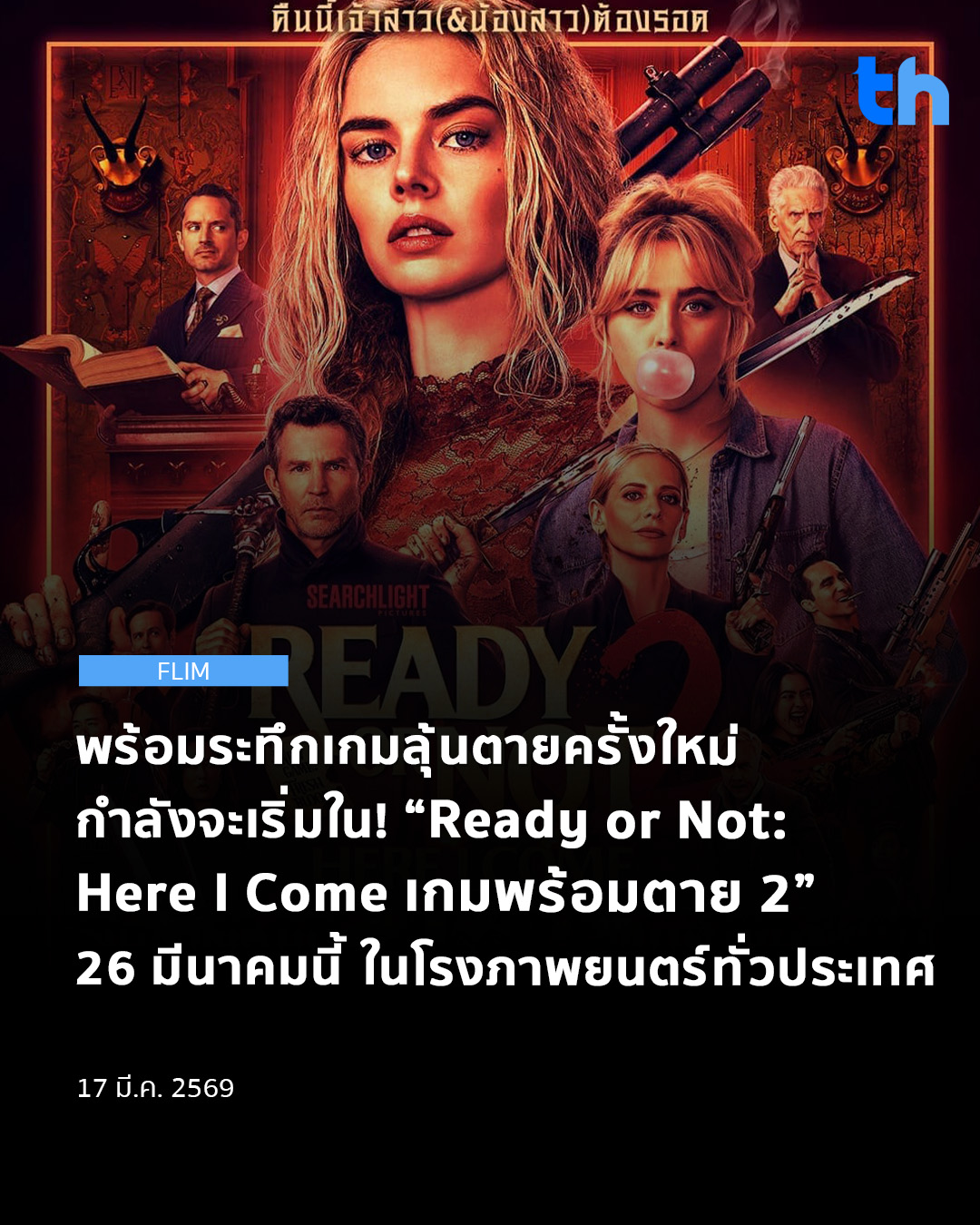 ยังจำภาพเจ้าสาวเลือดสาดกับการเอาชีวิตรอดจากเกมสุดคลั่งในคฤหาสน์สุดสยอง ที่สร้างปรากฏการณ์ความระทึกแบบตลกร้าย จนกลายเป็นภาพยนตร์ระทึกขวัญขวัญใจผู้ชมทั่วโลกในปี 2019 กันได้ไหม อีกไม่นานเกินรอ เจ้าสาวคนเดิมกำลังจะกลับมา พร้อมกับการล่าครั้งใหม่ใน “Ready or Not: Here I Come เกมพร้อมตาย 2” ภาคต่อของภาพยนตร์สุดเดือดจากคู่หูกำกับ Matt Bettinelli-Olpin และ Tyler Gillett แห่ง Radio Silence ที่จะพาผู้ชมกลับสู่เกมเอาชีวิตรอดที่ลุ้นระทึกยิ่งขึ้น เลือดสาดยิ่งกว่า และคลั่งเกินกว่าใครจะคาดคิด ด้วยการขยายความโหดแบบคูณสี่ กับเดิมพันครั้งใหม่ที่ใหญ่กว่าเดิม พร้อมพาทุกคนเข้าสู่ความโกลาหลแบบทวีคูณ 26 มีนาคมนี้ ในโรงภาพยนตร์
